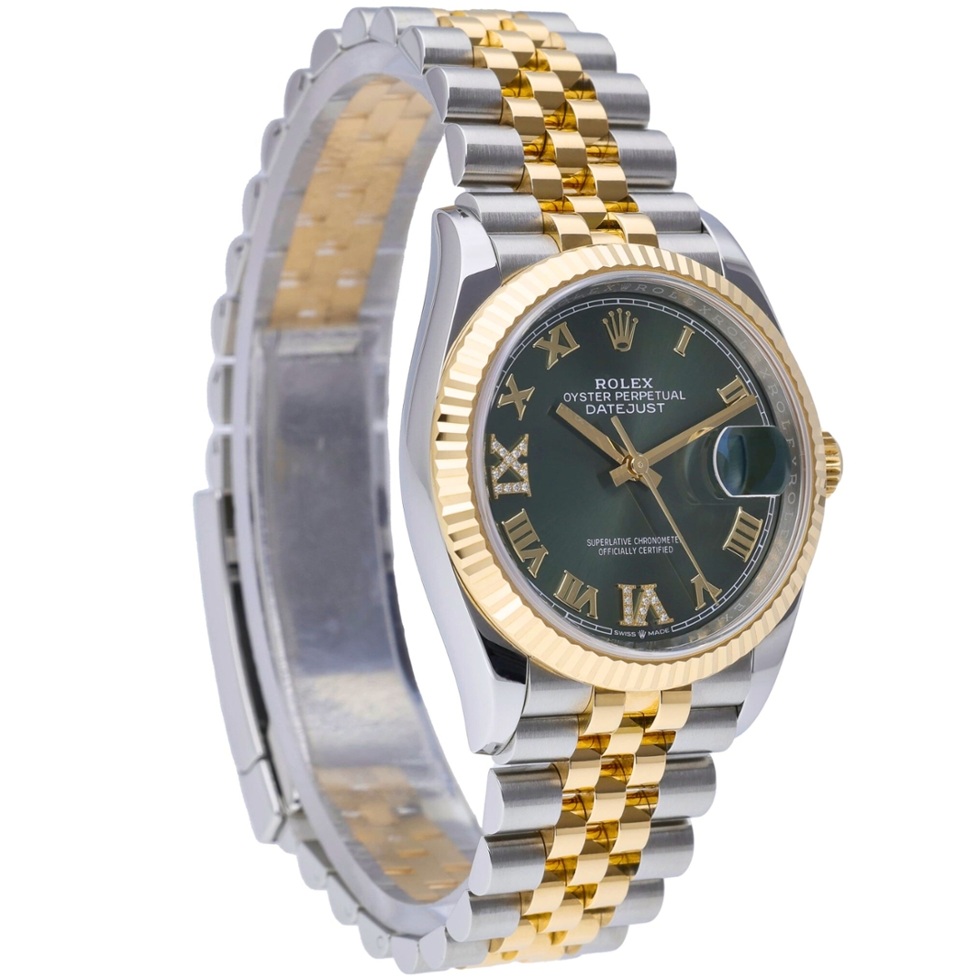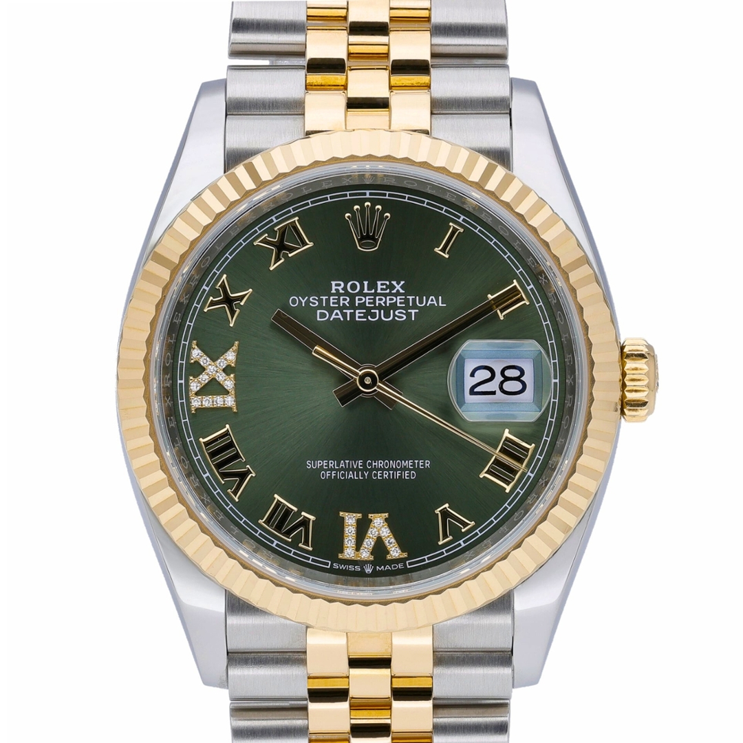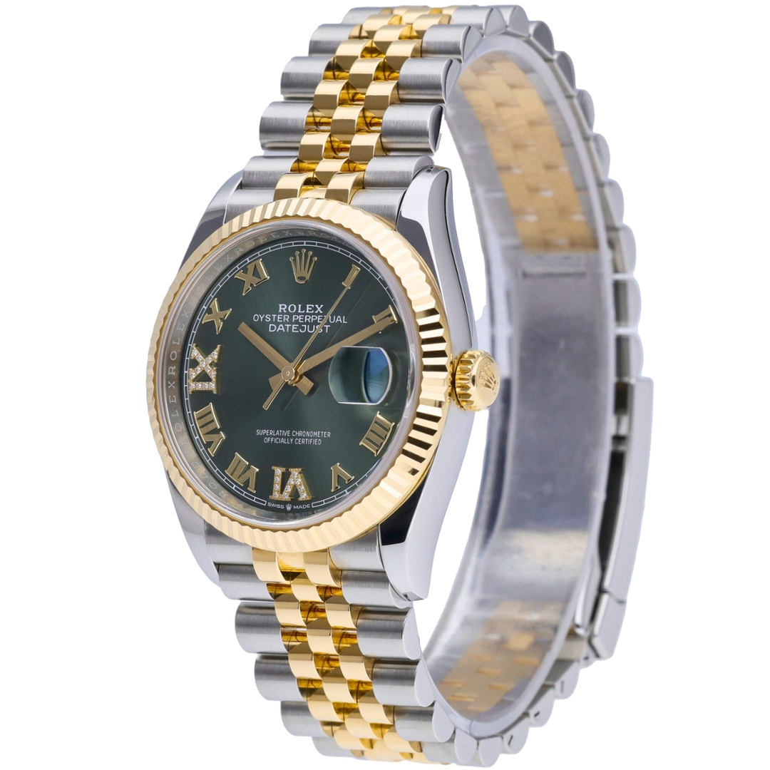 A Rolex Datejust Watch in stainless steel and 18ct yellow gold, showcasing the distinctive green sunburst dial with gold Roman numerals and factory-set diamond markers. The classic 36mm Oyster case is complemented by the signature yellow gold fluted bezel, creating the refined two-tone aesthetic that has defined the Datejust collection for generations. The rich green dial displays a subtle radial sunburst finish, while the diamond-set Roman numerals add a luxurious highlight that elevates this already elegant configuration.