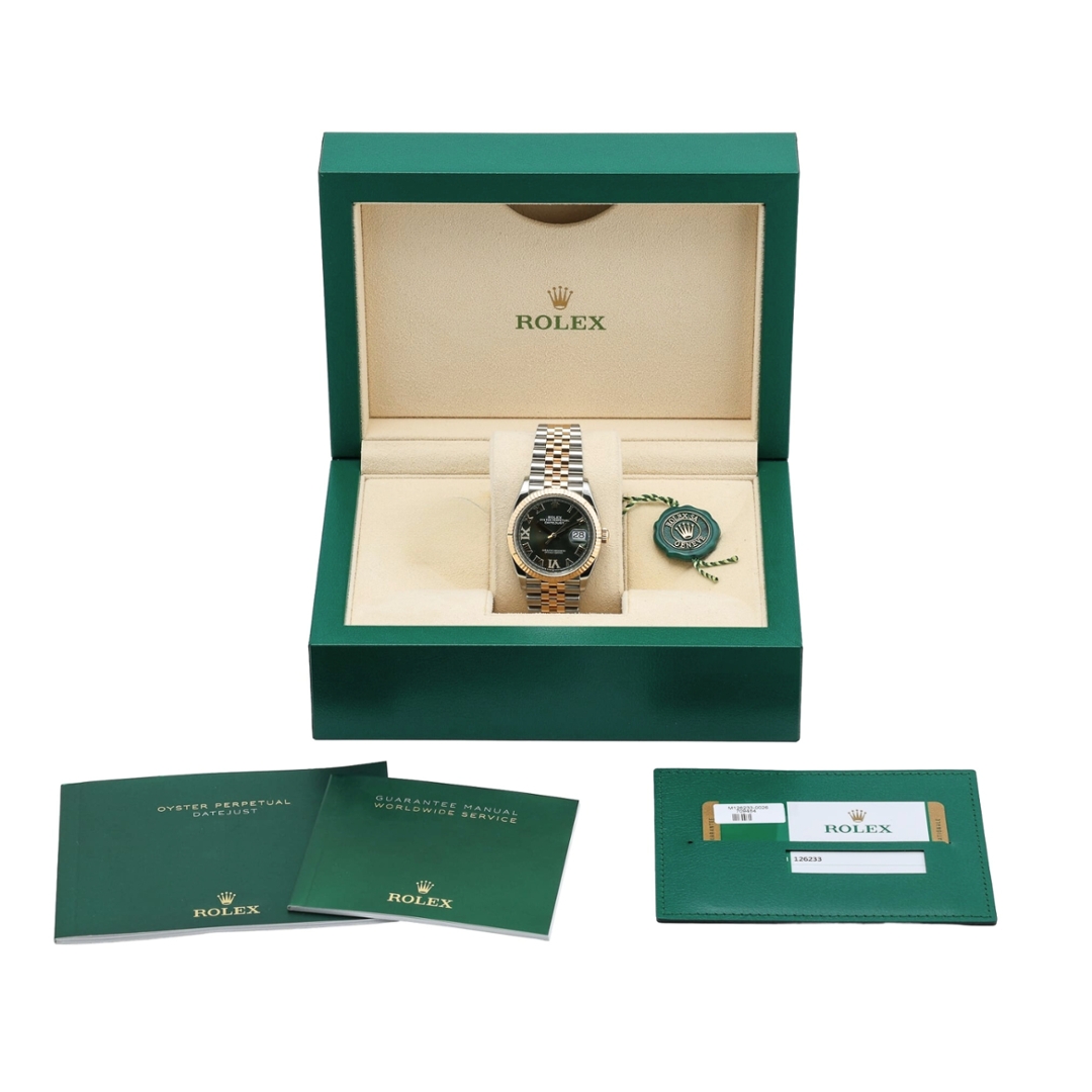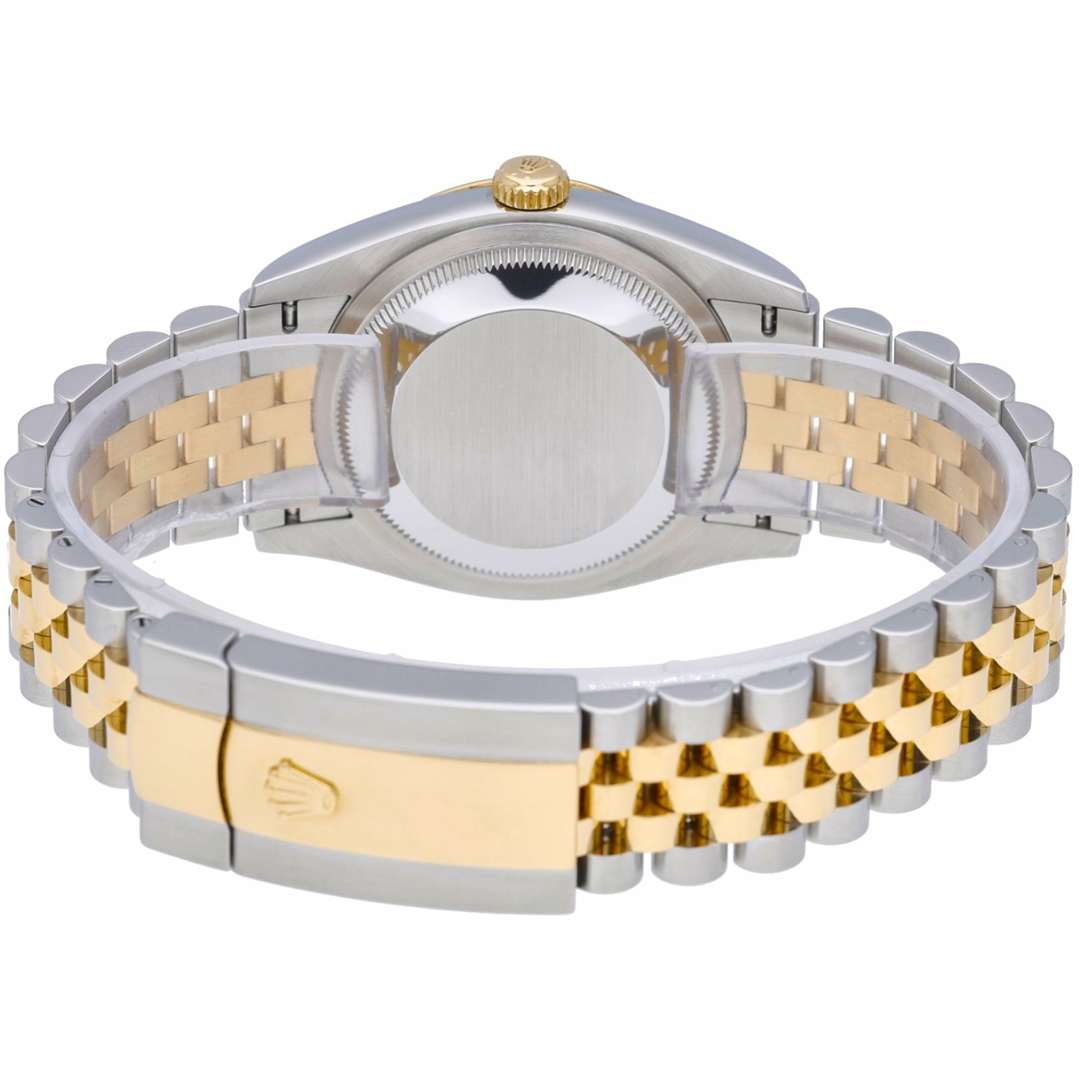 Powered by the Rolex Calibre 3235 automatic movement, this reference offers exceptional precision, durability and a power reserve of approximately 70 hours. The Cyclops lens above the date window ensures instant readability, while the balanced proportions and timeless design maintain the Datejust’s reputation as one of Rolex’s most versatile watches. The two-tone Jubilee bracelet further enhances the watch’s classic appearance, combining stainless-steel outer links with polished yellow-gold centre links.