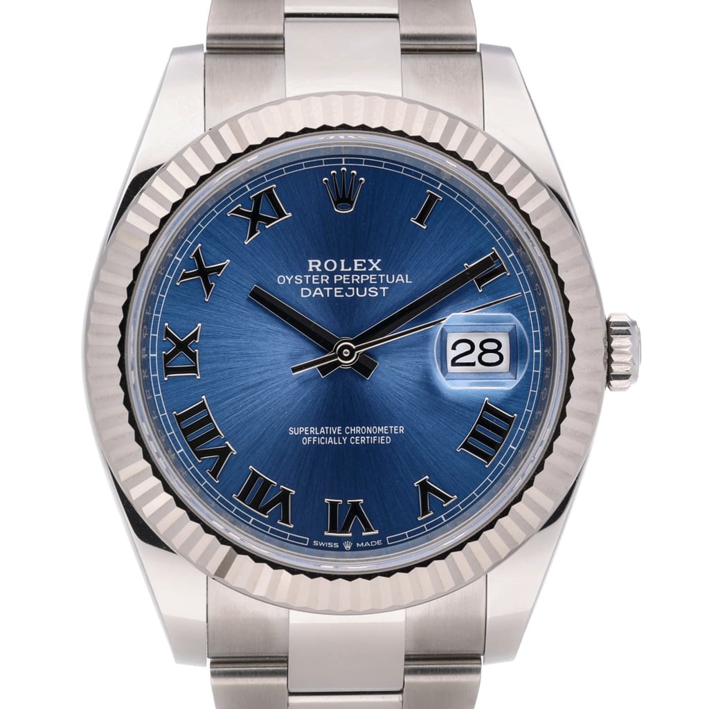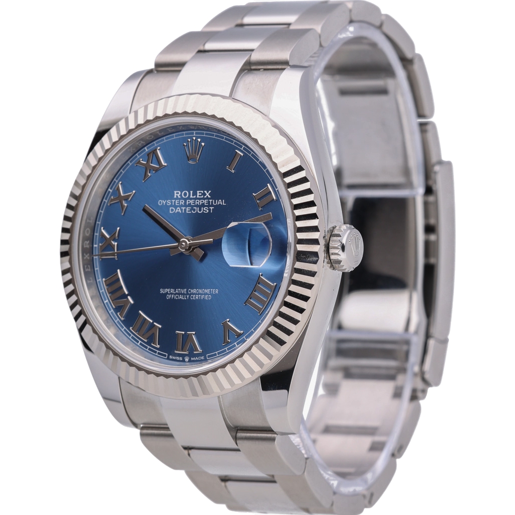 A Rolex Datejust 41 Watch, Stainless Steel with an 18ct White Gold Fluted Bezel on an Azzuro Blue Roman Dial.