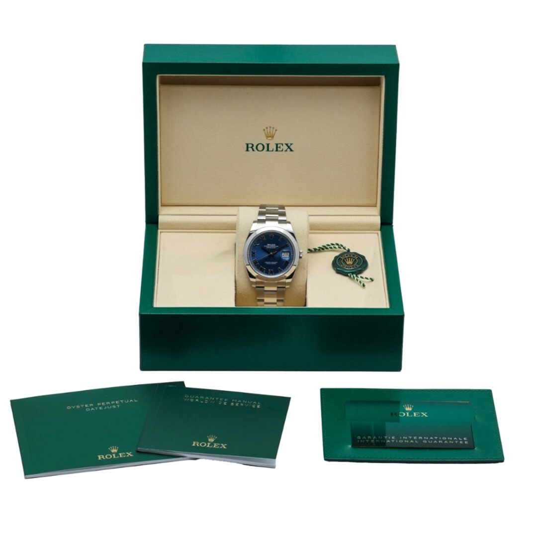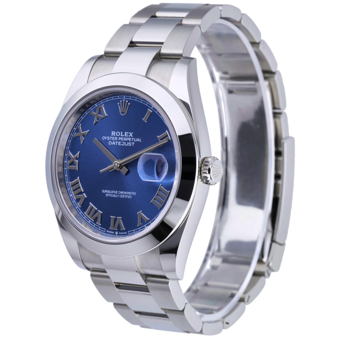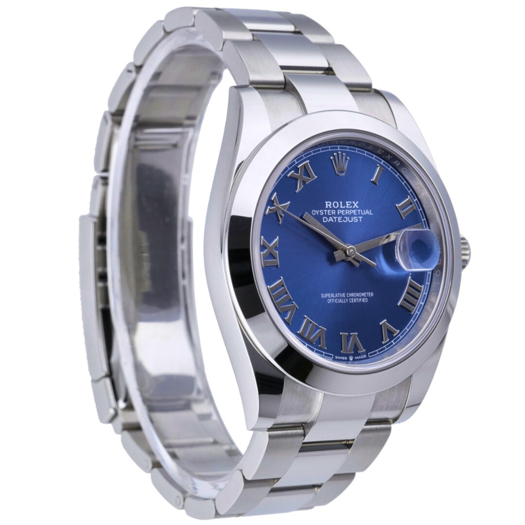 A Rolex Datejust 41 Watch, Stainless Steel on an Azzuro Blue Roman Dial.
