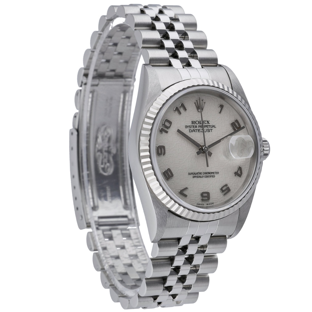 A Rolex Datejust 36, reference 16234, presented in stainless steel with an 18ct white gold fluted bezel, offering a refined and timeless configuration within the classic Datejust range. The 36mm Oyster case is paired with the Jubilee bracelet, delivering both comfort and traditional appeal, while maintaining the recognisable profile that has defined the model for decades.