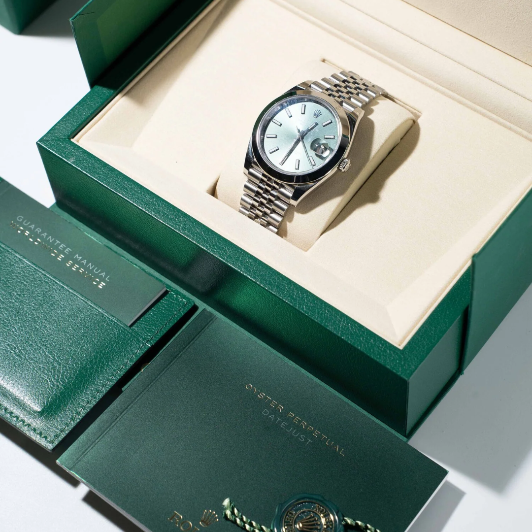 Presented in immaculate condition, this example comes complete with original paperwork, box, and certification, and is covered by a Rolex manufacturer's warranty until 2030. A highly sought-after modern Datejust configuration, with the mint green dial remaining one of the most desirable options in the current range.