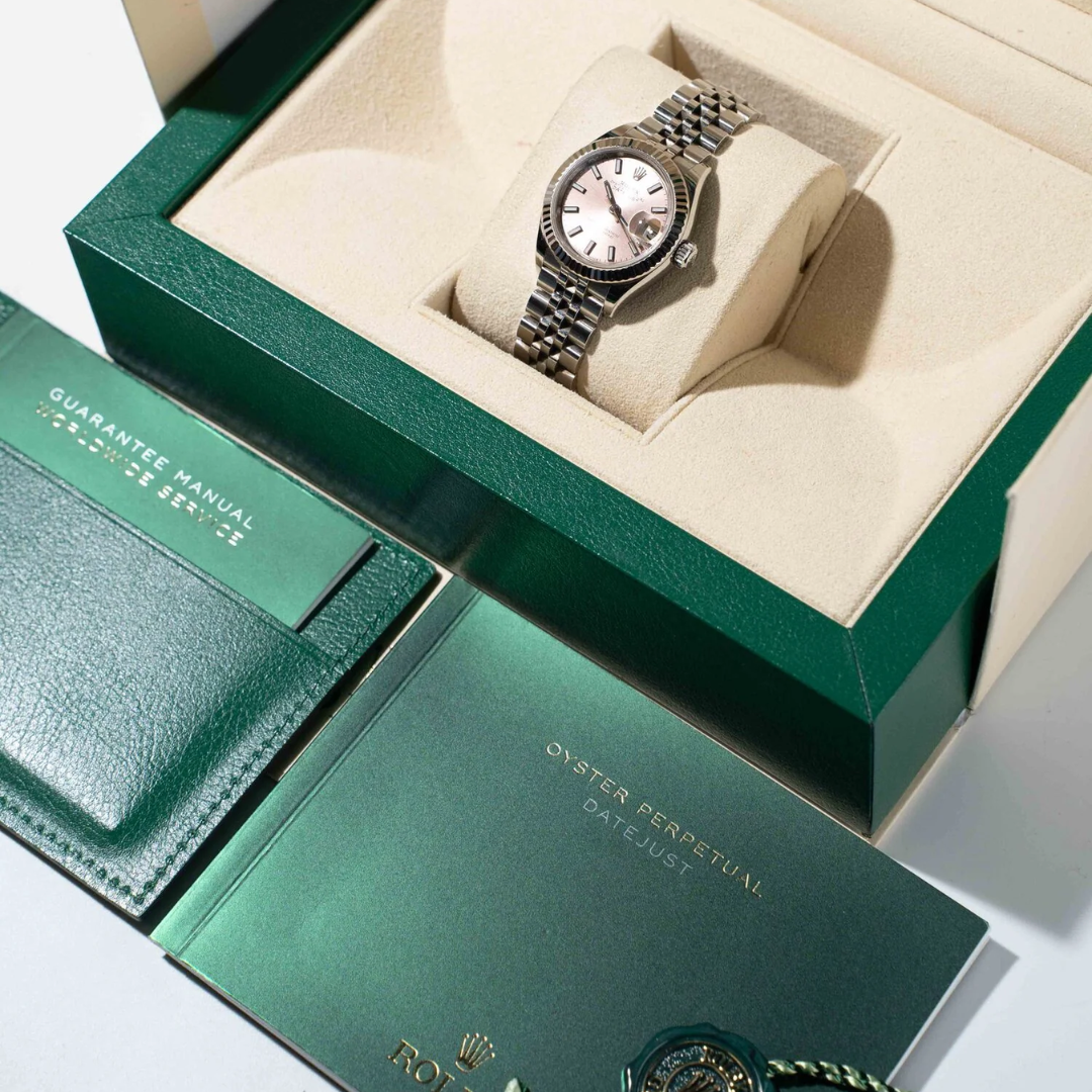 A Rolex Datejust 28 reference 279174 in stainless steel, enhanced by an 18ct white gold fluted bezel and presented in a refined 28mm Oyster case. The soft pink dial introduces a delicate yet distinctive aesthetic, complemented by applied baton hour markers and luminous hands, for a clean, elegant display with excellent legibility.