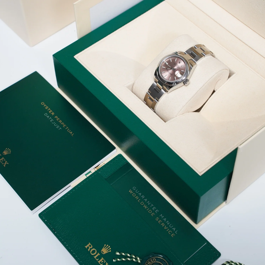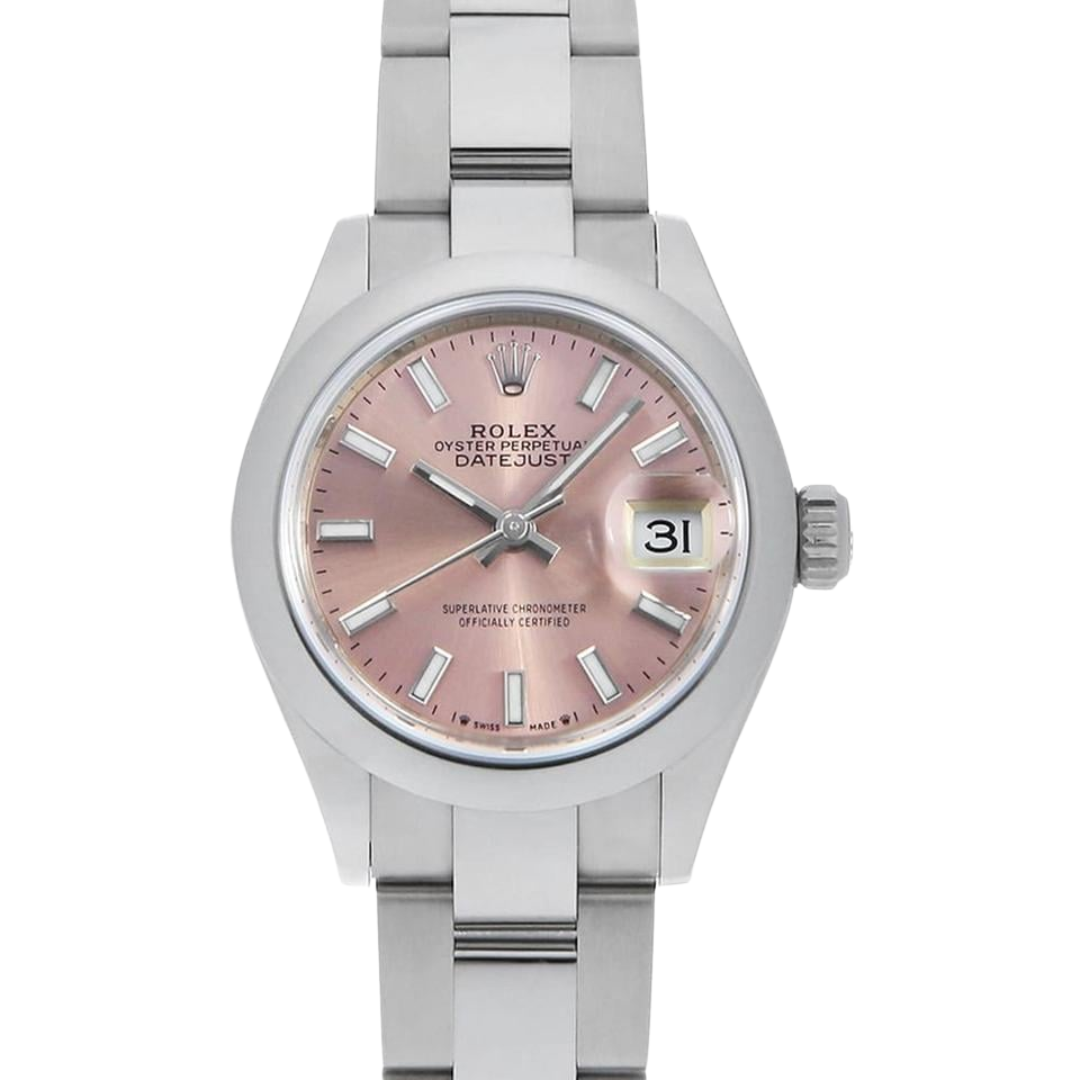A Rolex Datejust 28 reference 279160 in stainless steel, featuring a smooth bezel and a refined Oyster bracelet, offering a clean, contemporary interpretation of this enduring classic. The soft pink dial adds a subtle yet distinctive touch, complemented by applied baton hour markers and luminous hands, delivering both elegance and everyday versatility in a compact 28mm case.