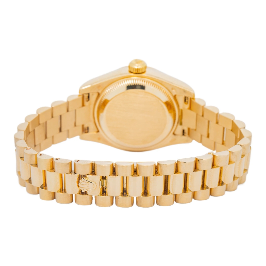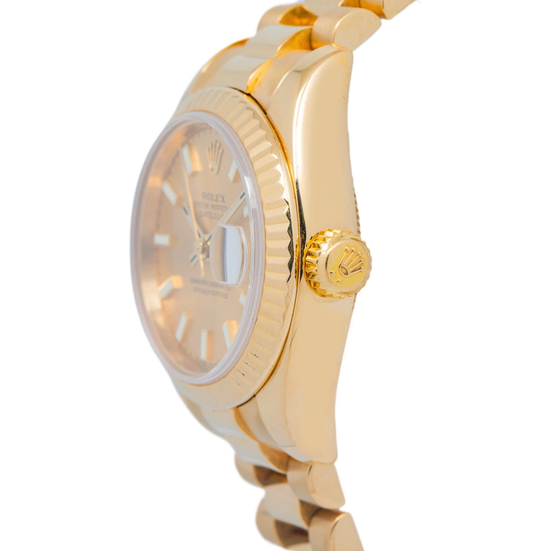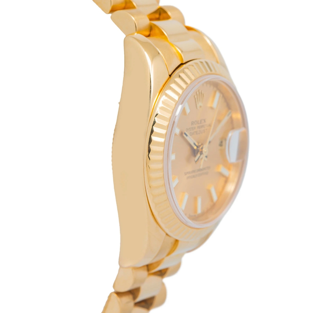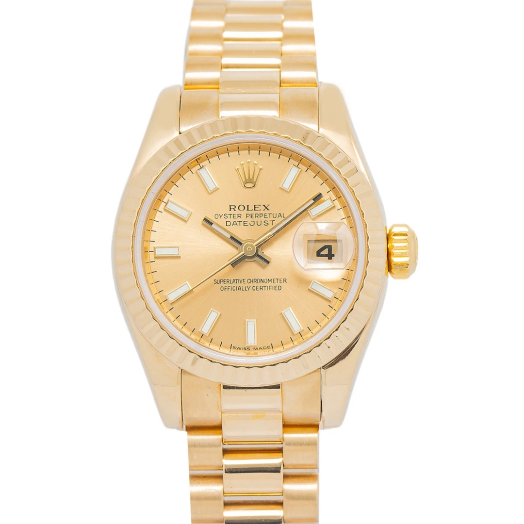 A Rolex Datejust reference 179178 in full 18ct yellow gold, presented with a fluted bezel and matching President bracelet, offering a timeless and unmistakably luxurious interpretation of this iconic model. The champagne dial complements the warmth of the yellow gold case beautifully, featuring applied baton hour markers and luminous hands for a clean, refined, and highly legible display within a classic 26mm case.