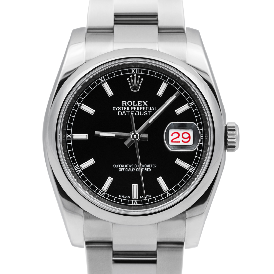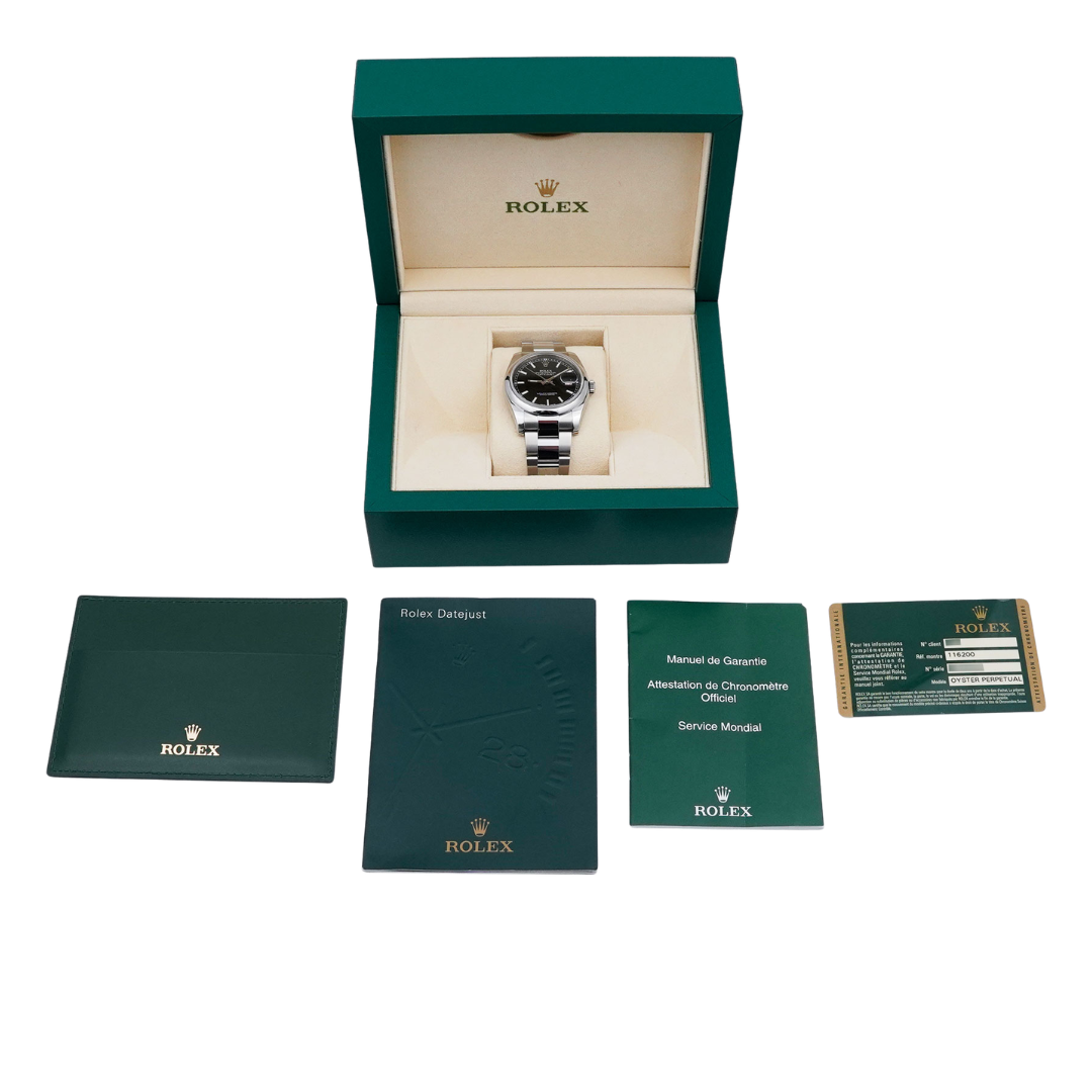 A Rolex Datejust 116200 crafted in stainless steel, presenting the timeless proportions of the classic 36mm Oyster case. The smooth steel bezel frames a striking black dial featuring applied baton hour markers, slim Roman numeral accents on the inner chapter ring, and the signature date aperture at 3 o’clock with Rolex’s Cyclops magnification. Paired with the robust Oyster bracelet, the watch delivers a balanced aesthetic.