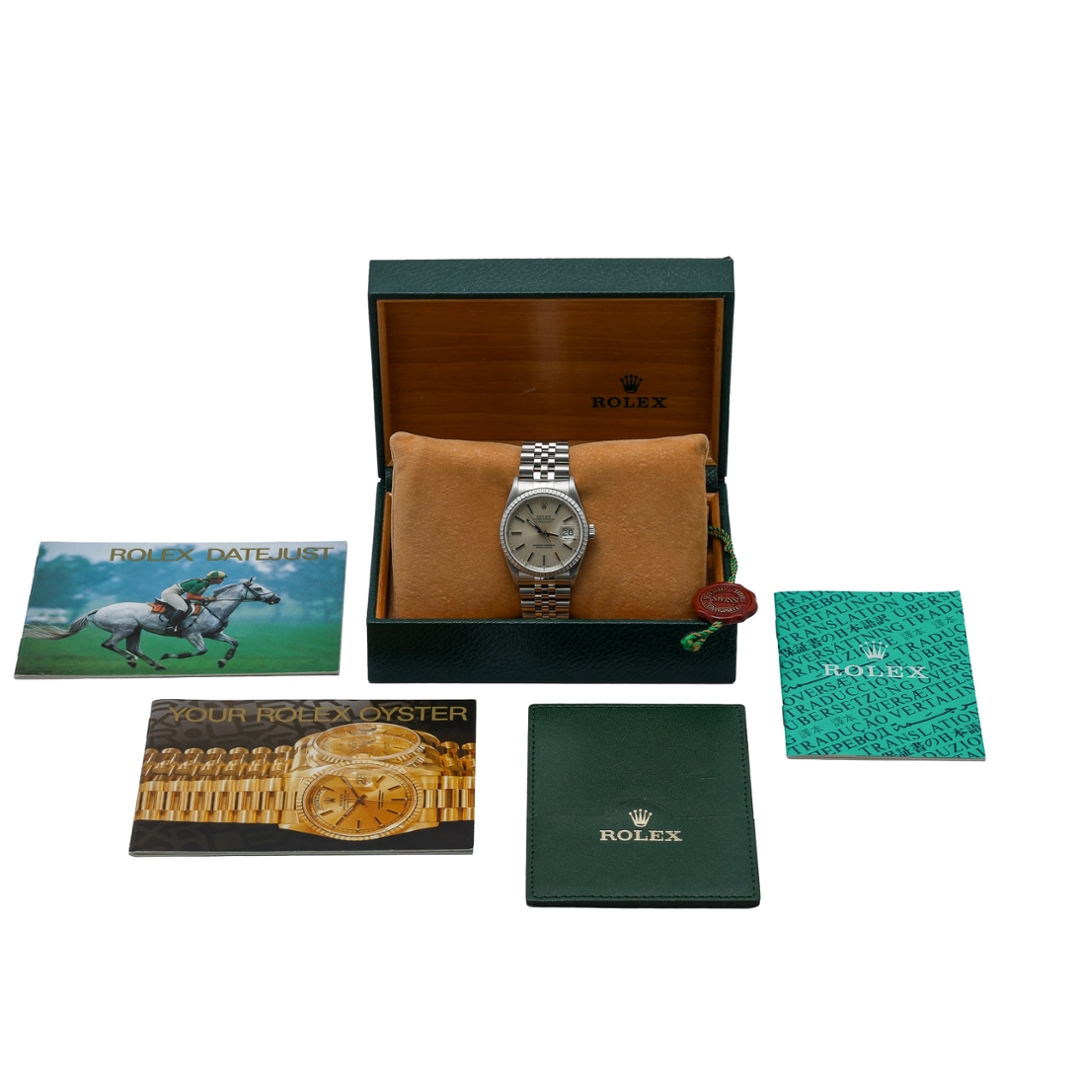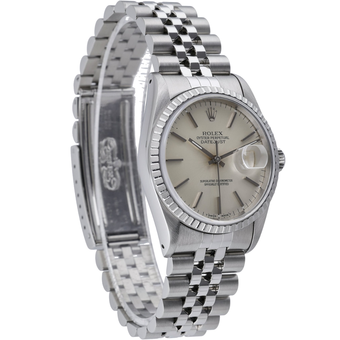 A Rolex Datejust Watch, Stainless Steel with an Engine Turned Bezel on a Silver Dial