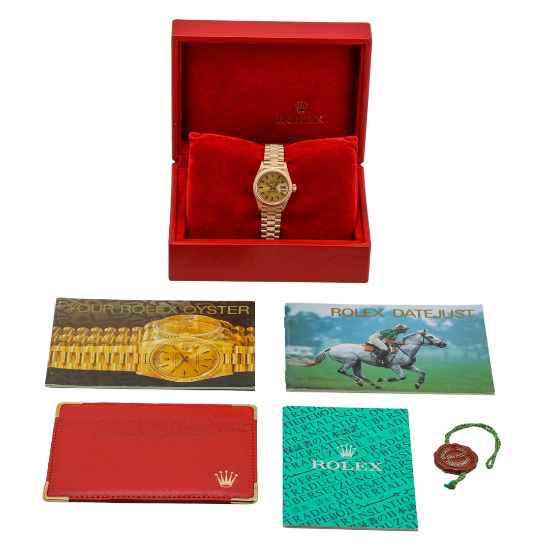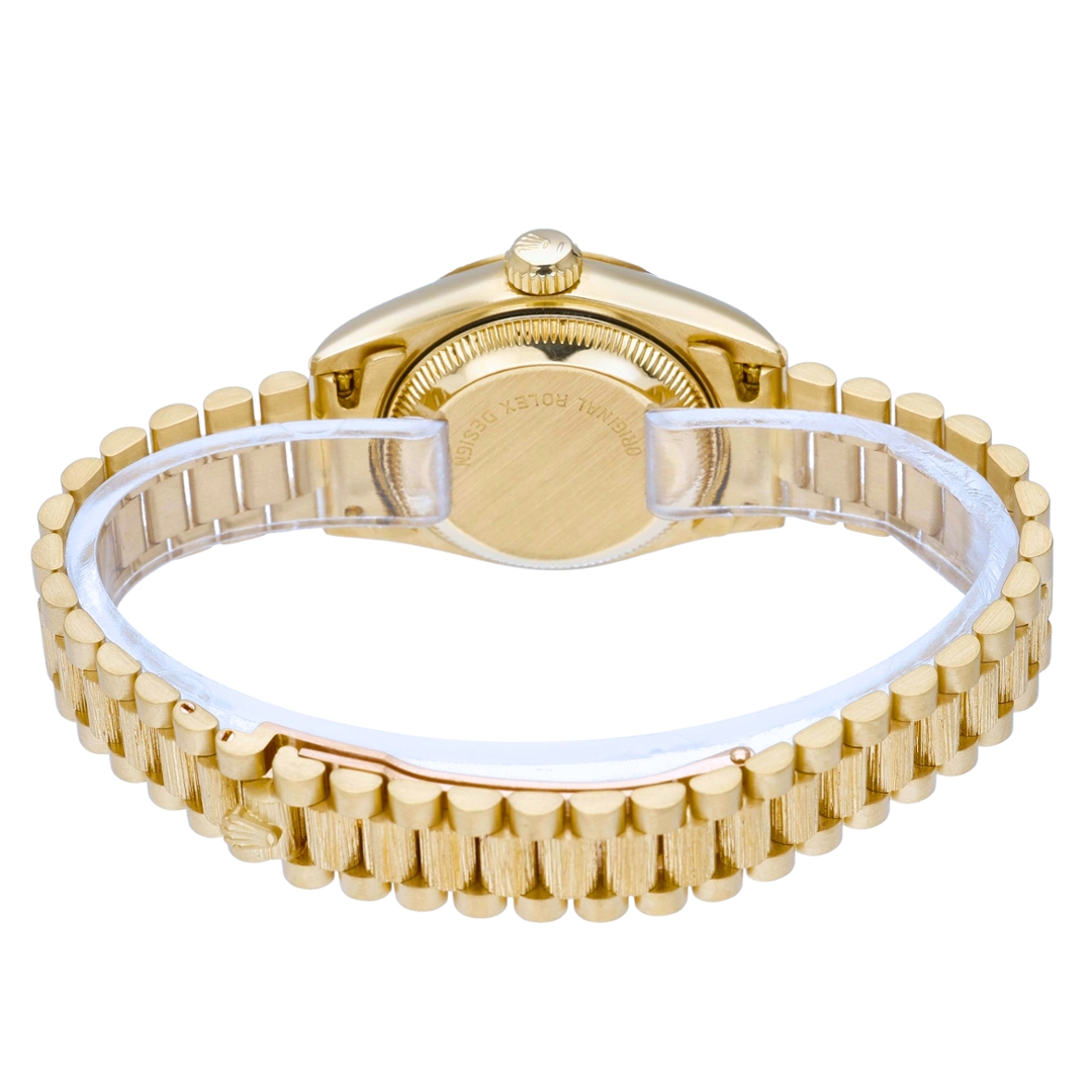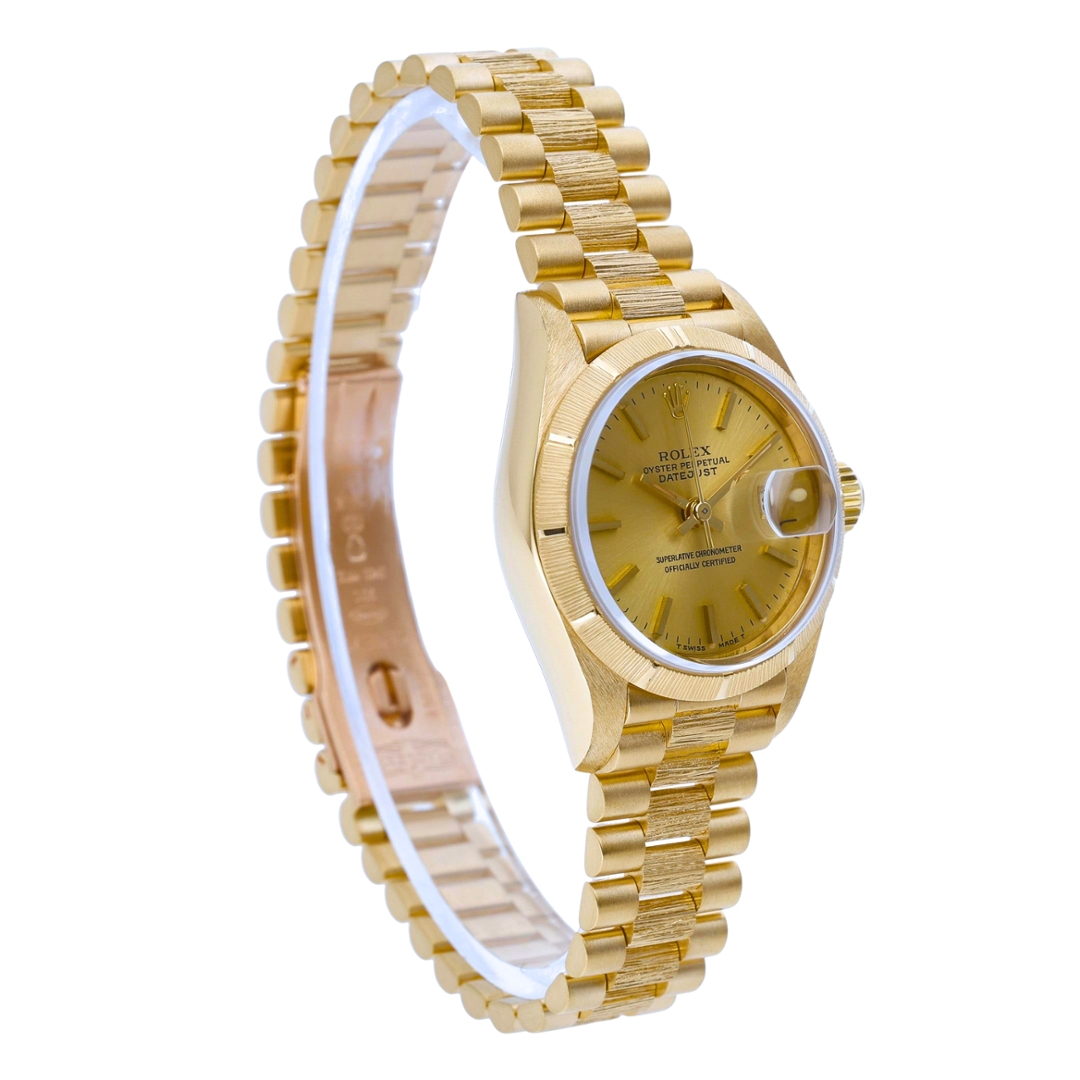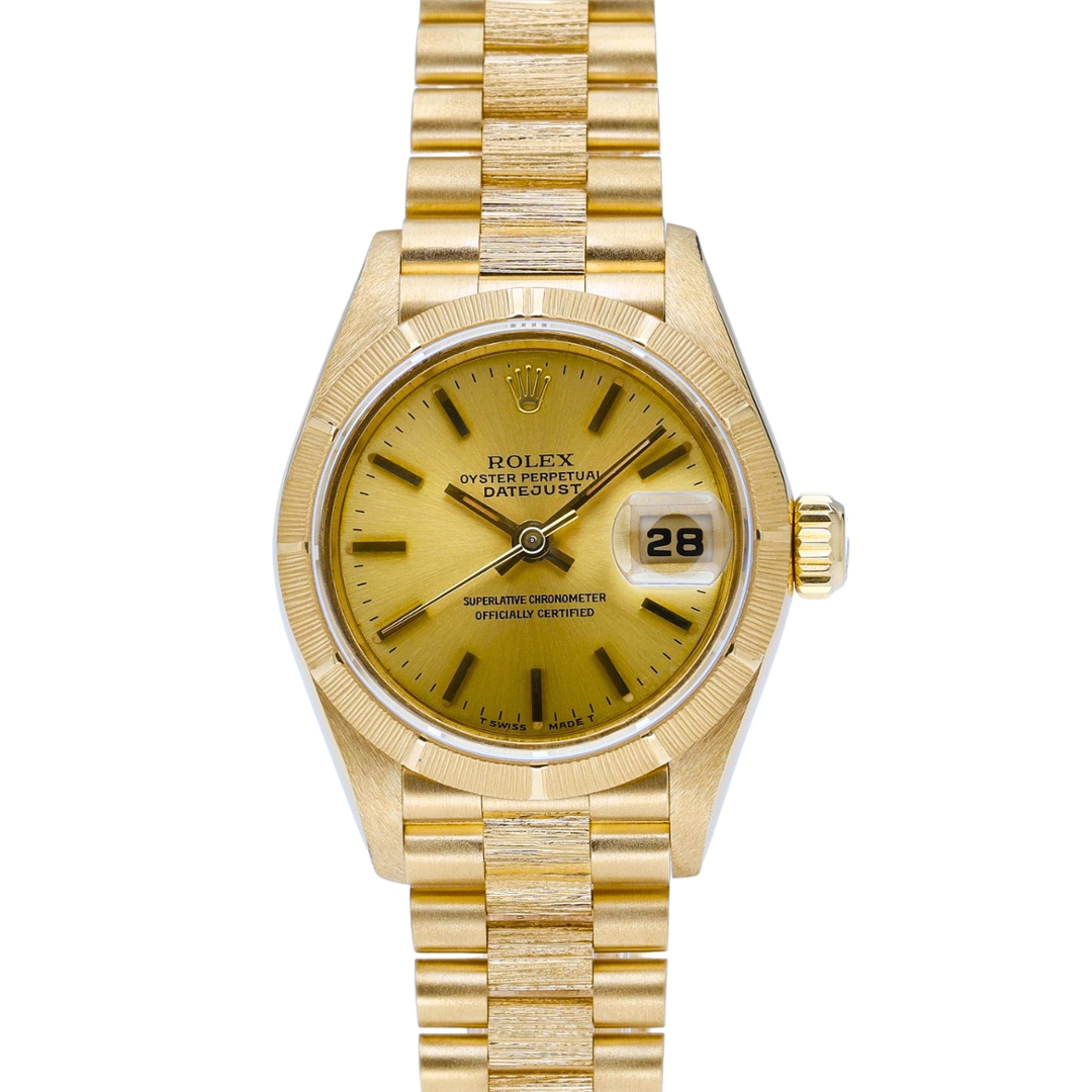 A Rolex Datejust, model 69278, presented in full 18ct yellow gold, showcasing a distinctive and highly desirable bark-finished design throughout. The 26mm case is complemented by a matching bark-finished bezel and Presidential bracelet, creating a rich texture that sets this piece apart from standard configurations. The champagne dial enhances the warm tones of the gold, finished with applied hour markers and a date display at 3 o’clock, magnified by the Cyclops lens for everyday practicality.