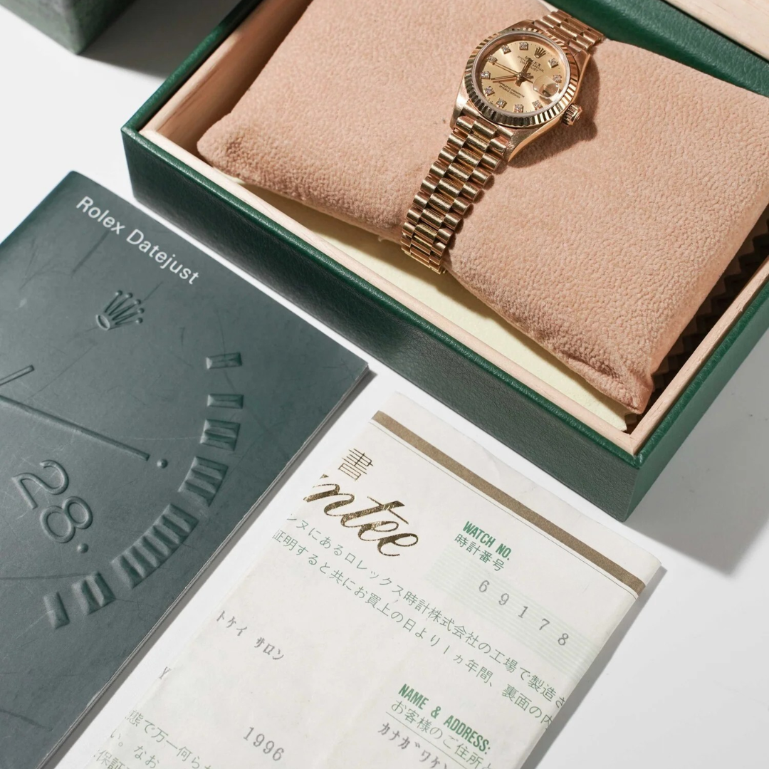 A Rolex Datejust reference 69178 in full 18ct yellow gold, featuring a classic champagne dial set with original Rolex diamond hour markers. The rich gold tones are perfectly matched to the fluted 18ct yellow gold bezel and President bracelet, delivering a timeless, luxurious aesthetic that defines the traditional Datejust design.
