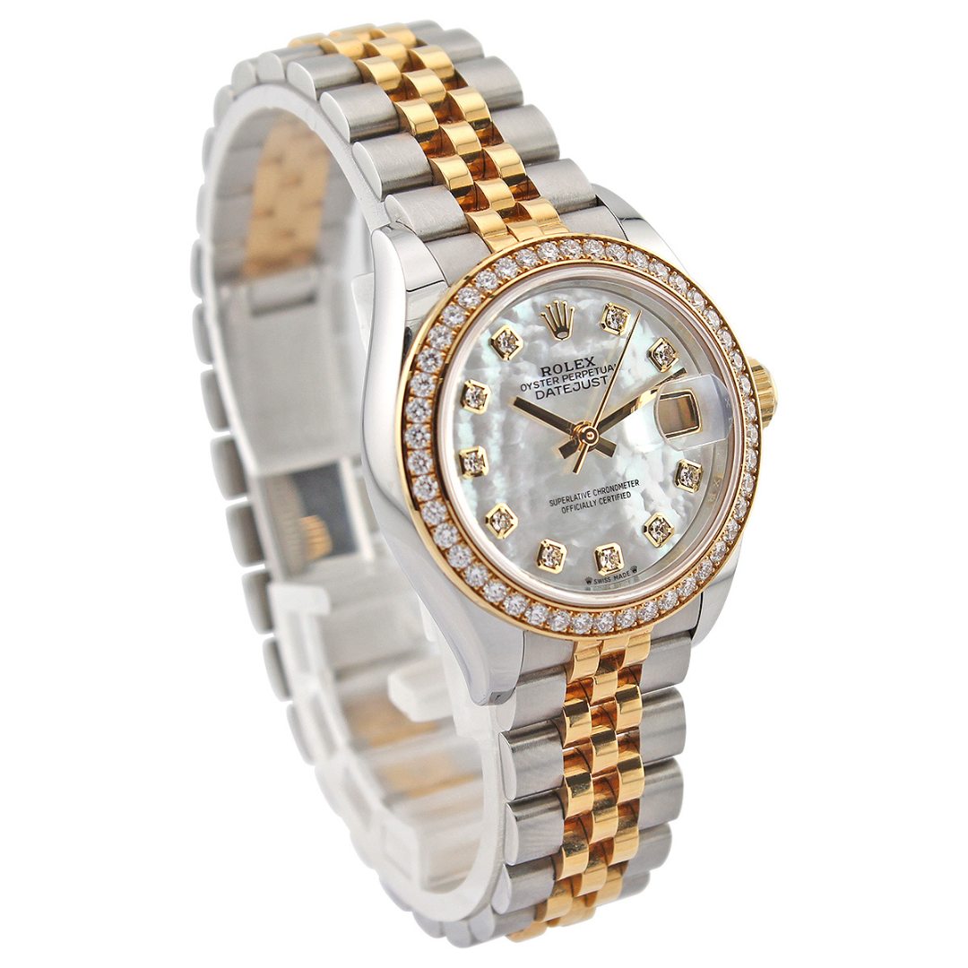 A Rolex Datejust 28 reference 279383RBR in stainless steel and 18ct yellow gold, featuring the factory original yellow gold diamond-set bezel. The white mother-of-pearl dial displays a soft iridescence, complemented by diamond hour markers set within yellow gold surrounds, enhancing both depth and elegance. The classic Jubilee bracelet in bi-metal construction completes the look, offering a refined, versatile presence that suits the 28mm case size.