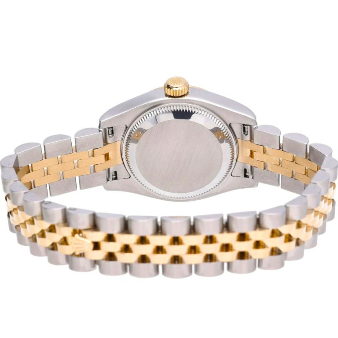 A Rolex Datejust reference 179173 in Bi-Metal stainless steel and 18ct Yellow Gold, featuring a fluted 18ct Yellow Gold bezel and a champagne dial with original Rolex diamond hour markers. The dial features applied gold surrounds, gold baton hands, and a date aperture at 3 o’clock with a Cyclops lens. The 26mm Oyster case presents a refined, compact profile, while the champagne dial maintains a classic, highly recognisable Datejust aesthetic.