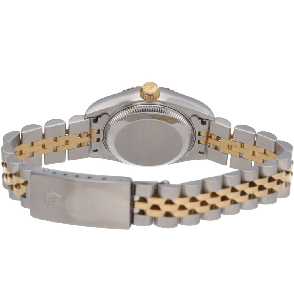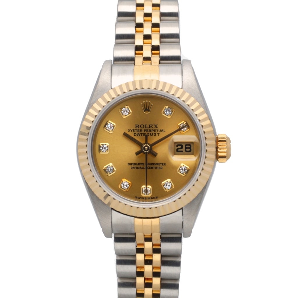 A Rolex Datejust reference 79173 in Bi-Metal stainless steel and 18ct Yellow Gold, featuring a fluted 18ct Yellow Gold bezel and a champagne dial with original Rolex diamond hour markers. The dial features applied gold surrounds, gold baton hands, and a date aperture at 3 o’clock with a Cyclops lens. The 26mm Oyster case maintains classic proportions, while the champagne dial delivers a traditional, highly recognisable Datejust configuration.