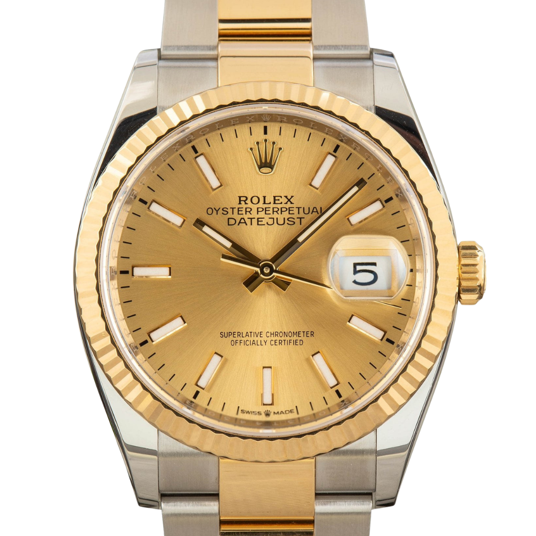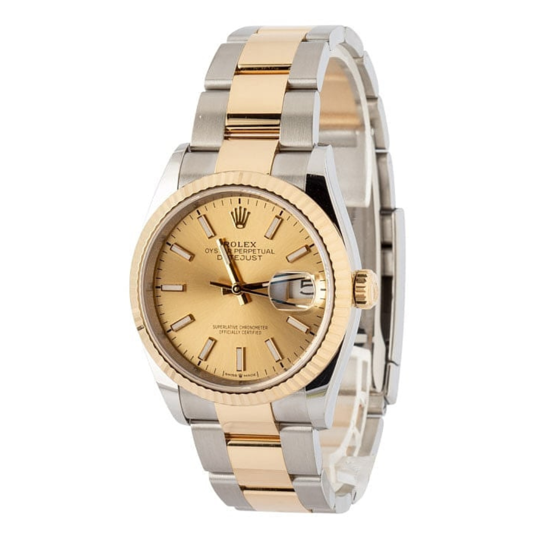 A Rolex Datejust 36 reference 126233 in bi-metal stainless steel and 18ct yellow gold, featuring a classic champagne sunburst dial with applied baton hour markers and the iconic Cyclops date display. The yellow gold fluted bezel adds depth and presence, perfectly complementing the warm dial tone, while the Oyster bracelet adds a more contemporary, sporty feel to this timeless configuration.