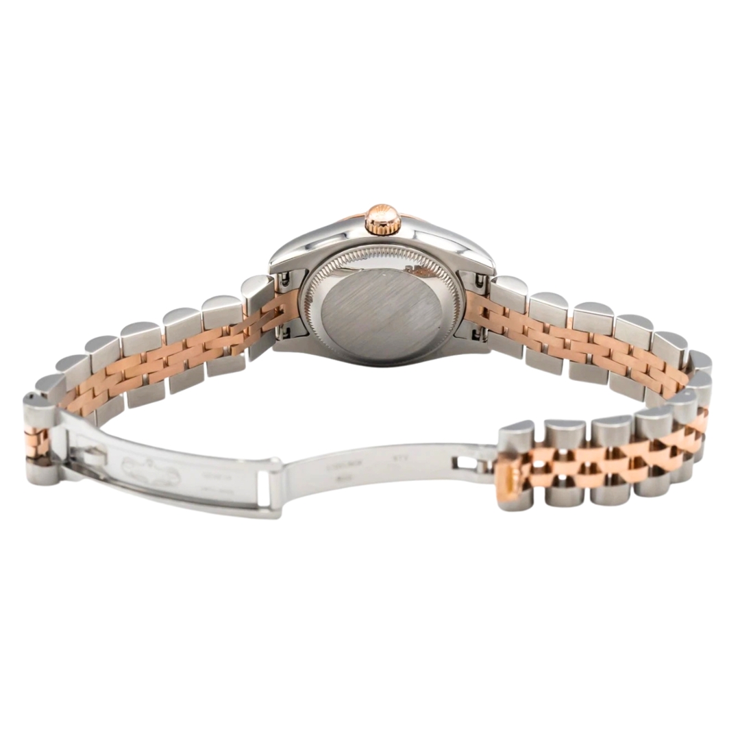 A Bi-Metal Rolex Datejust Watch, reference 179171, is presented in a refined combination of stainless steel and 18ct Everose gold. The 26mm case is complemented by a rose gold fluted bezel, adding depth and elegance, while the black dial provides a striking contrast. Set with original Rolex diamond hour markers, the dial offers both luxury and legibility, enhanced by the signature Cyclops lens over the date display. The iconic Jubilee bracelet completes the look with timeless versatility.