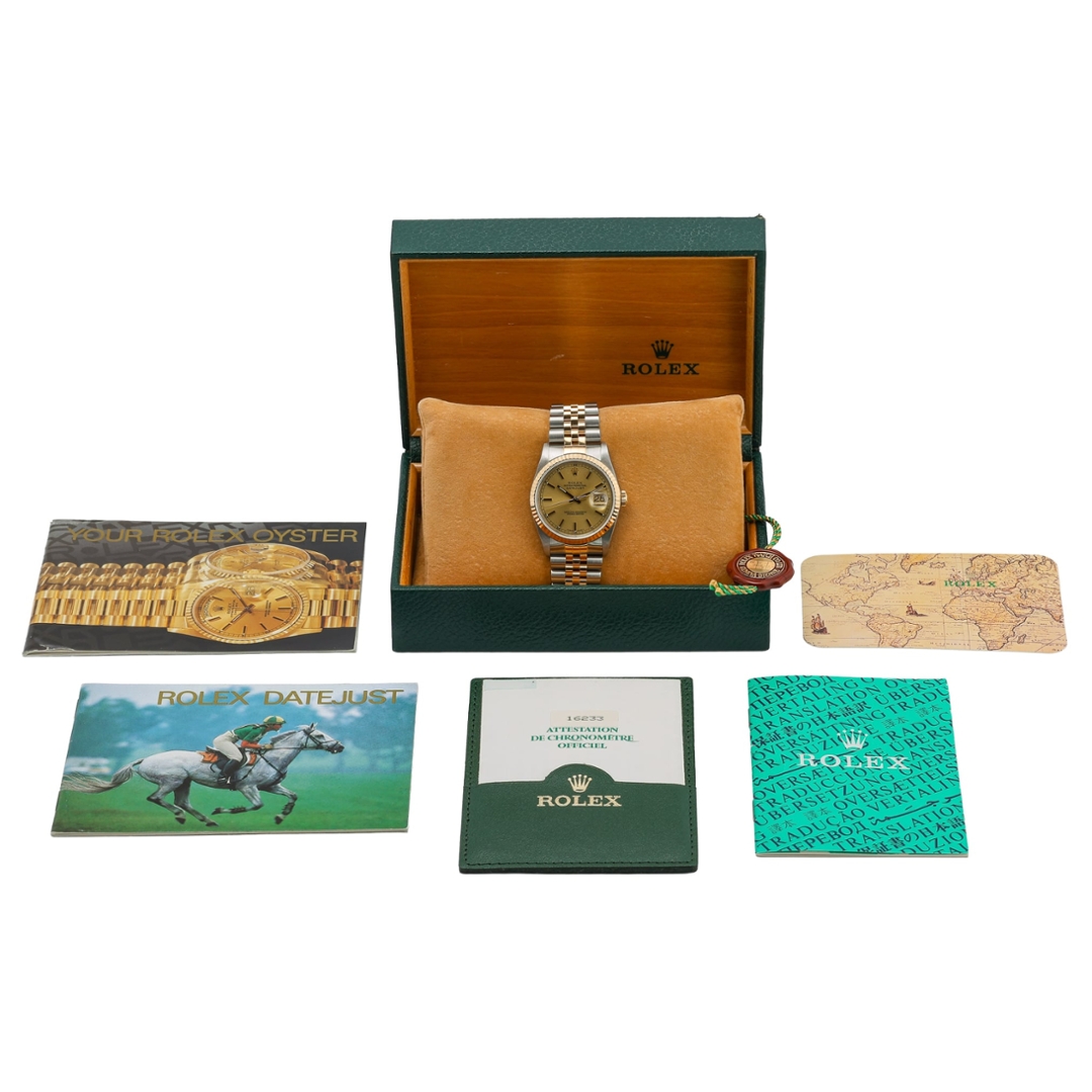 A Rolex Datejust 16233 in its most recognisable and enduring configuration, combining stainless steel and 18ct yellow gold with the signature fluted bezel and classic champagne dial. The 36mm case delivers a balanced and versatile wrist presence, while the warm tones of the dial and gold accents create a refined, unmistakably Rolex aesthetic that has remained in demand for decades.