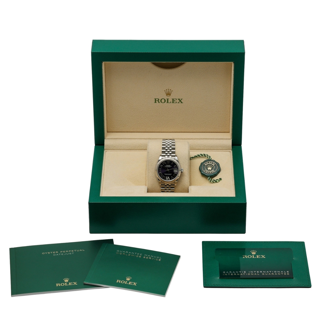 A Rolex Datejust watch crafted in stainless steel, featuring a captivating purple sunray dial that adds a contemporary touch to this timeless classic. Model number 278274, this 2022 example is powered by the Rolex Calibre 2236 automatic movement, offering exceptional accuracy, reliability, and a 55-hour power reserve. The 31mm Oyster case provides a refined and versatile presence on the wrist, complemented by the elegant fluted bezel in solid 18ct white gold—a hallmark of Rolex sophistication.