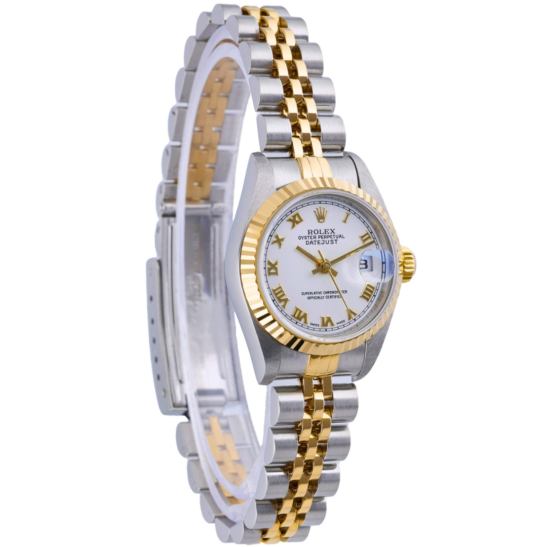 A Bi-Metal Rolex Datejust combining stainless steel and 18ct yellow gold, presented in the classic 26mm case with the iconic Jubilee bracelet. The yellow gold fluted bezel adds a signature Rolex detail, framing a clean white dial set with applied Roman numeral hour markers in gold tones, delivering a timeless and elegant aesthetic that remains highly sought after.