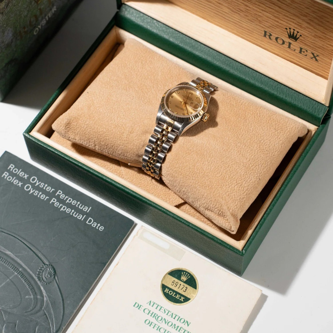 A Rolex Datejust 26 69173, presented in a 26mm Oyster case crafted from stainless steel and 18ct yellow gold, embodies the classic elegance that defines the Datejust line. The champagne dial features applied Arabic numerals, offering a warm and distinctive aesthetic, complemented by matching hands and refined detailing. The signature Cyclops lens at 3 o’clock enhances the date display, while the fluted yellow gold bezel provides the unmistakable light reflection synonymous with Rolex design.