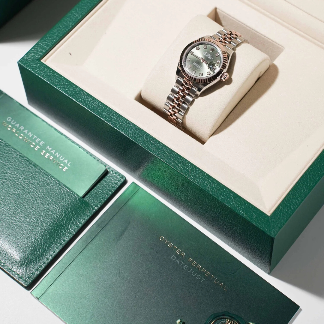 From an investment perspective, green-dial Rolex models and diamond-set Datejust configurations have seen rising demand in recent years, particularly in smaller case sizes, where supply is more limited. The combination of Everose gold, factory-set diamonds, and a contemporary production year positions this reference as a highly desirable and collectable piece within the modern Rolex catalogue.