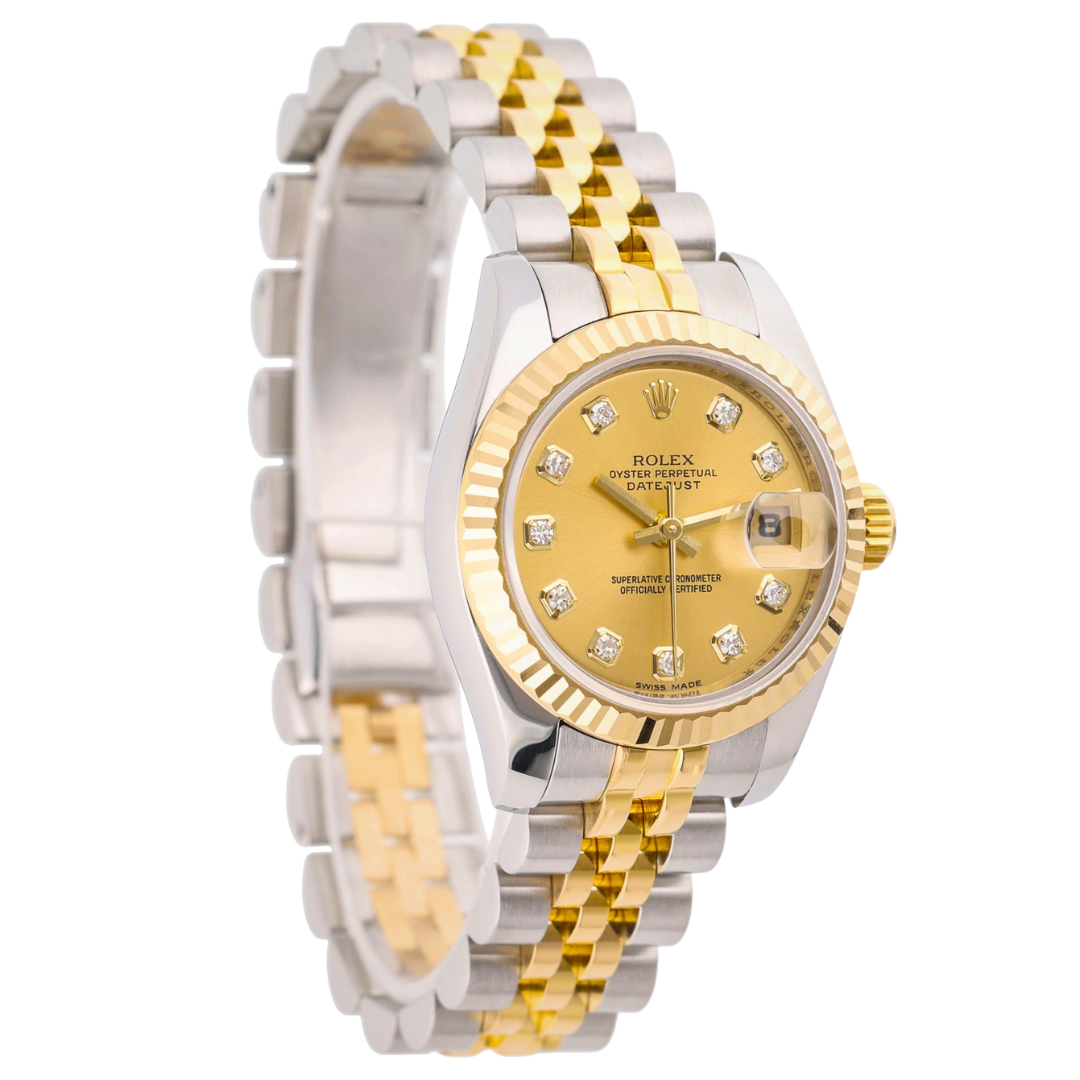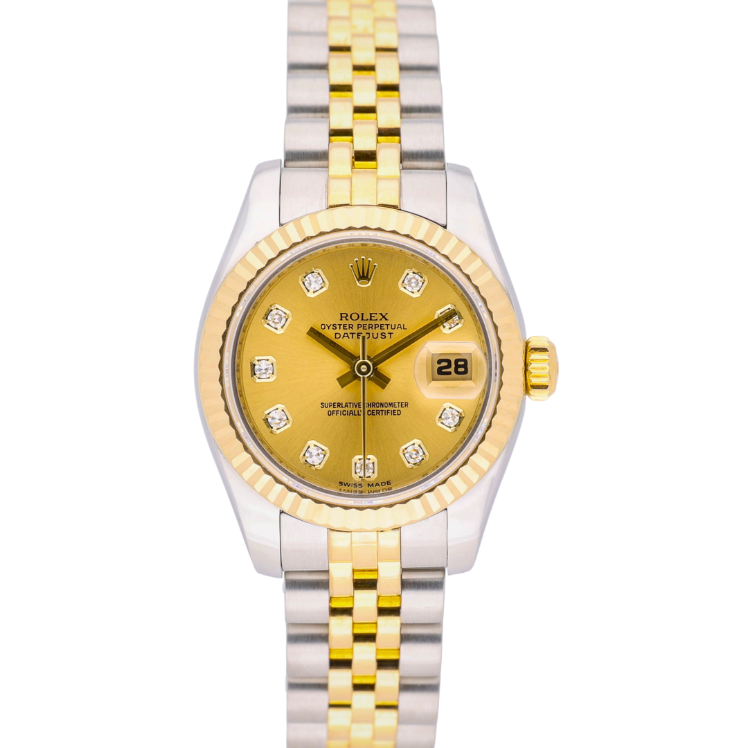 A bi-metal Rolex Datejust 179173, combining stainless steel and 18ct yellow gold with the classic fluted bezel and matching Jubilee bracelet. This 26mm model is elevated by a champagne dial set with original Rolex diamond hour markers, delivering a refined and unmistakably luxurious aesthetic that remains timeless within the Datejust range.