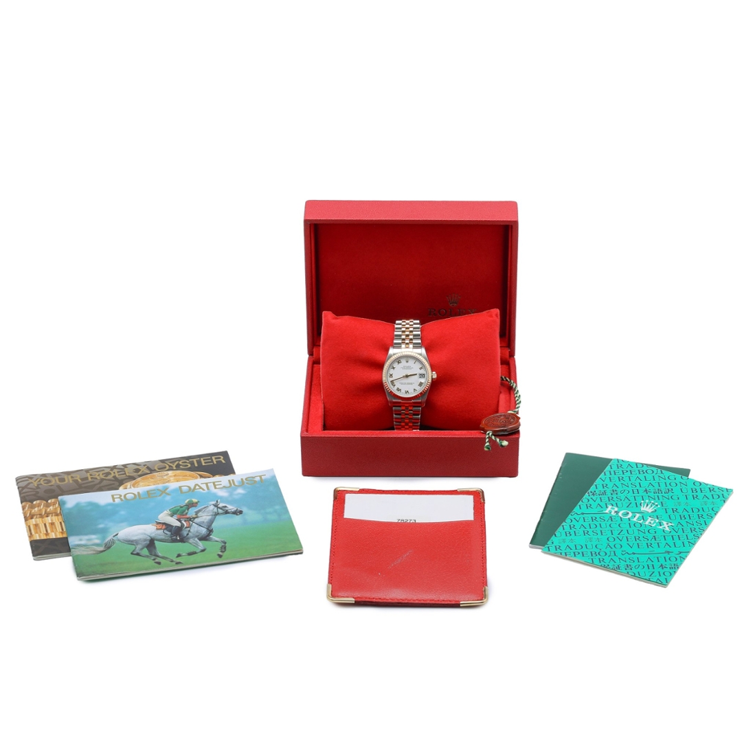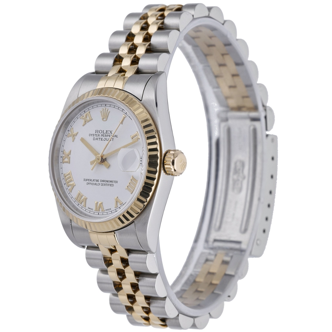 A bi-metal Rolex Datejust watch crafted from stainless steel and 18ct yellow gold, featuring a crisp white dial that highlights the elegance of this classic mid-size model. Model number 78273, this 2000 example is powered by the reliable Rolex Calibre 2235 automatic movement—renowned for its precision, durability, and smooth performance. The 31mm case offers a perfect blend of refinement and versatility, making it ideal for those who prefer a sophisticated yet understated timepiece.