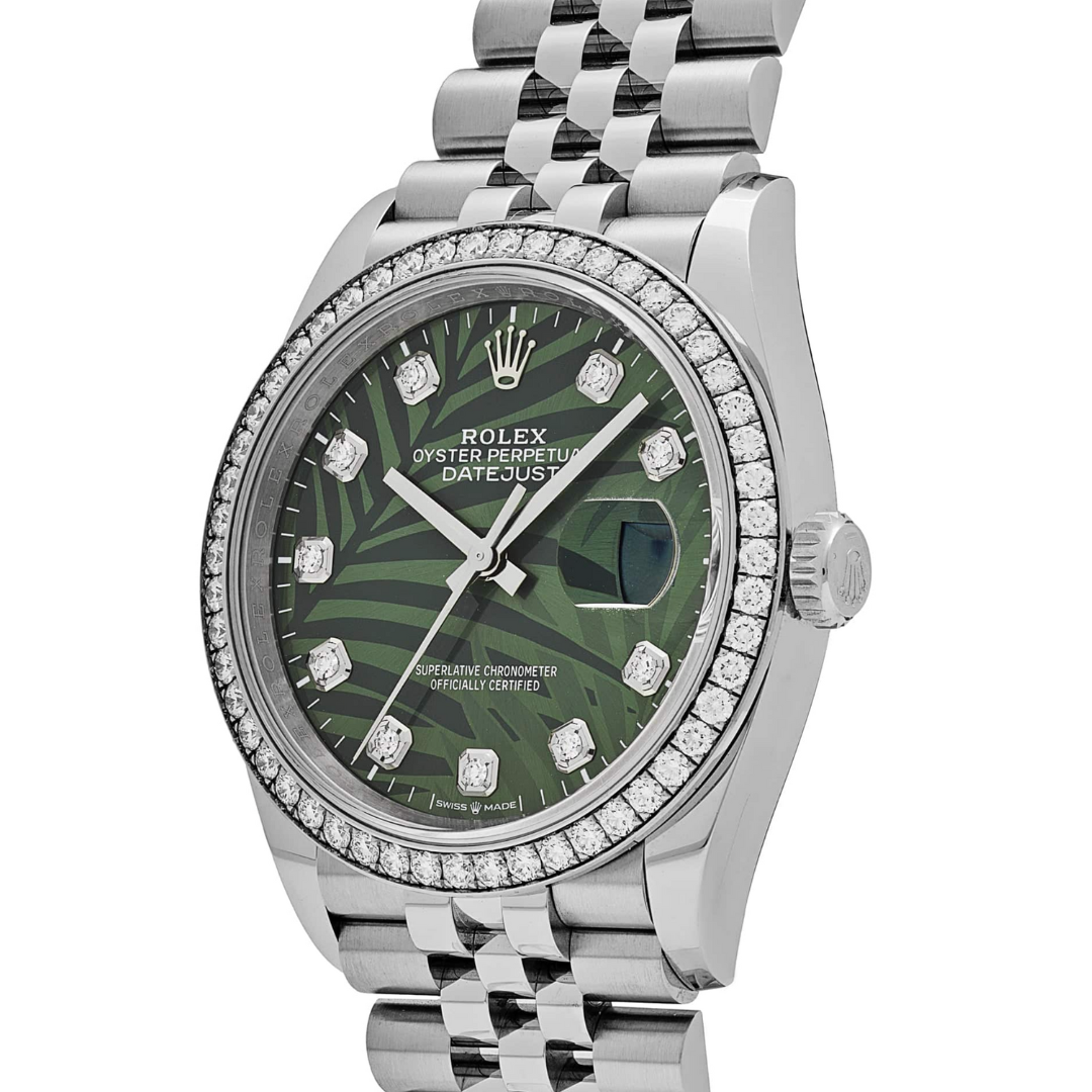 A Rolex Datejust Watch, Stainless Steel with an 18ct White Gold Diamond Bezel and a Green Palm Dial.