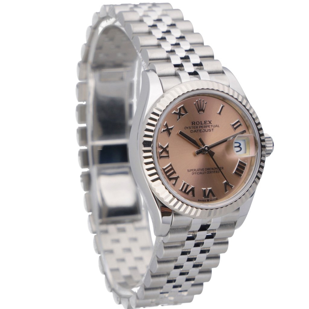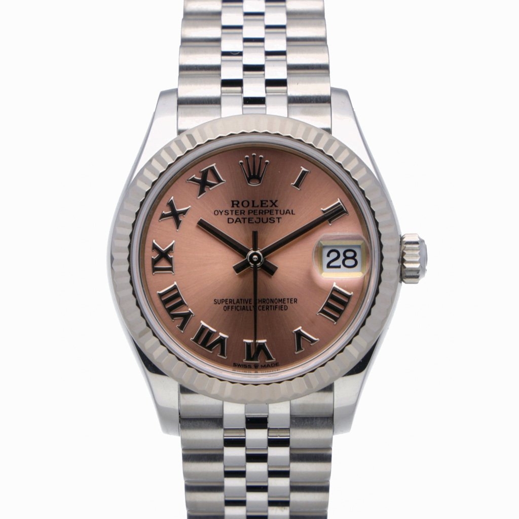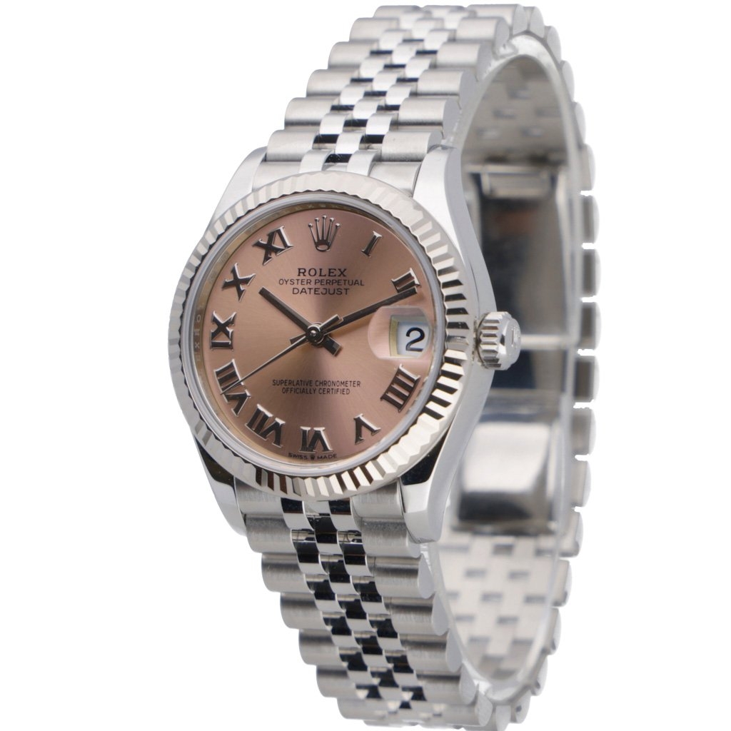 This 2021 Rolex Datejust 31 (ref. 278274) captures refined femininity and timeless elegance through its delicate pink dial and classic white gold fluted bezel. The soft pastel dial adds a subtle yet captivating contrast to the polished Oystersteel case, reflecting Rolex’s signature balance between luxury and everyday wearability.