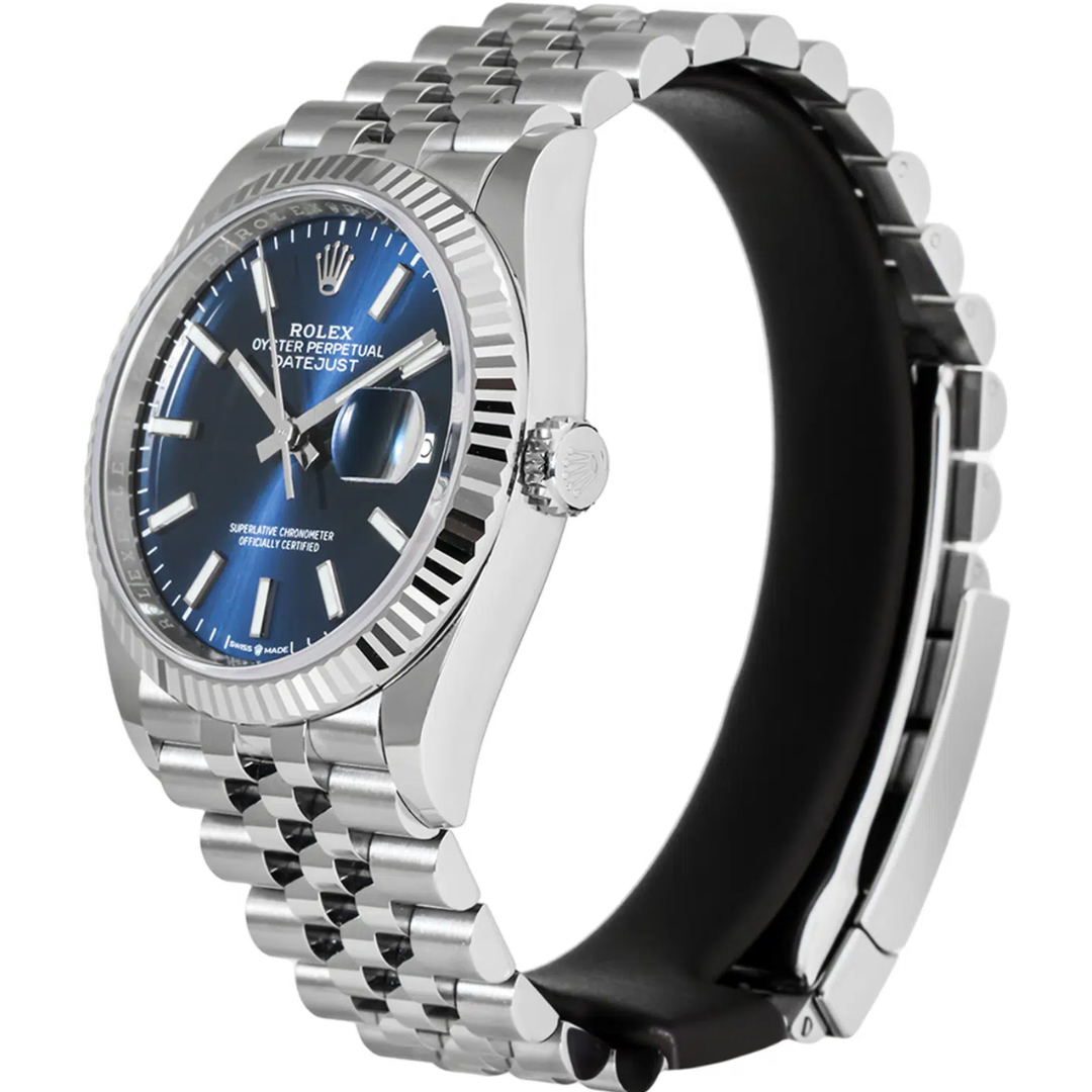 This 2024 Rolex Datejust 126234 combines timeless design with modern luxury, featuring a radiant sunburst blue dial that shimmers beautifully in changing light. The combination of Oystersteel, an 18ct white gold fluted bezel, and the elegant five-link Jubilee bracelet delivers a refined and unmistakably Rolex aesthetic.