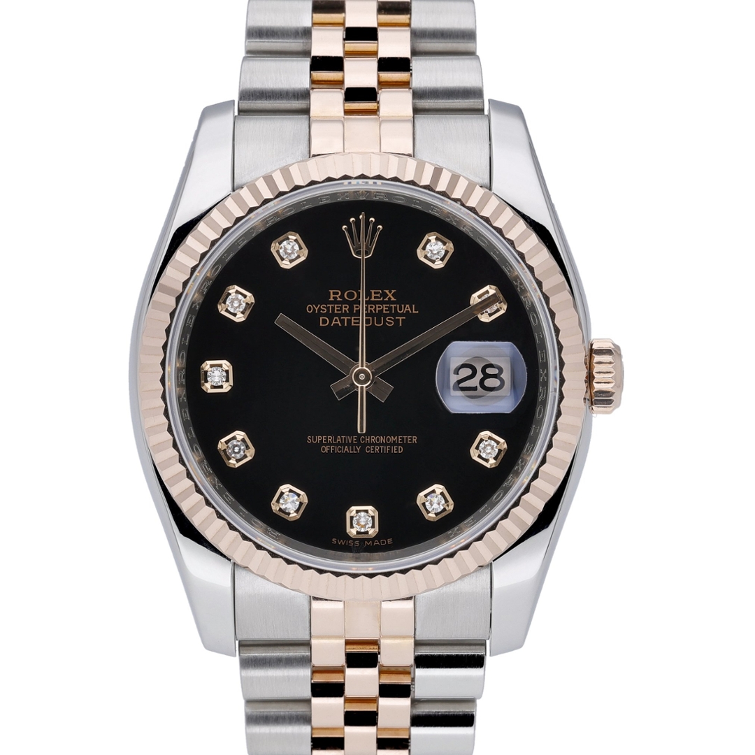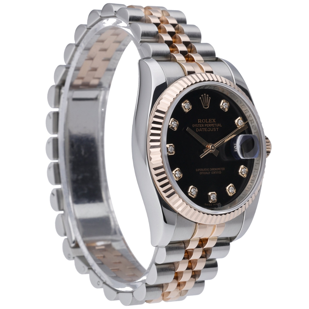A Bi-Metal Rolex Datejust 36 Watch, Stainless Steel & 18ct Rose Gold on a Black Dial with Original Rolex Diamond Numerals