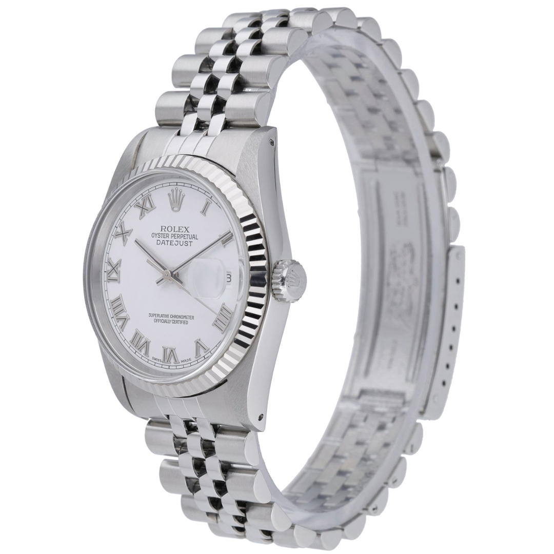 A Rolex Datejust 36, model 16234, perfectly embodies the enduring sophistication and craftsmanship synonymous with the Rolex name. Crafted from stainless steel and finished with an 18ct white gold fluted bezel, this elegant timepiece captures the timeless appeal of the classic Datejust design. The crisp white dial, detailed with bold black Roman numeral hour markers, creates a striking contrast that enhances both legibility and style.