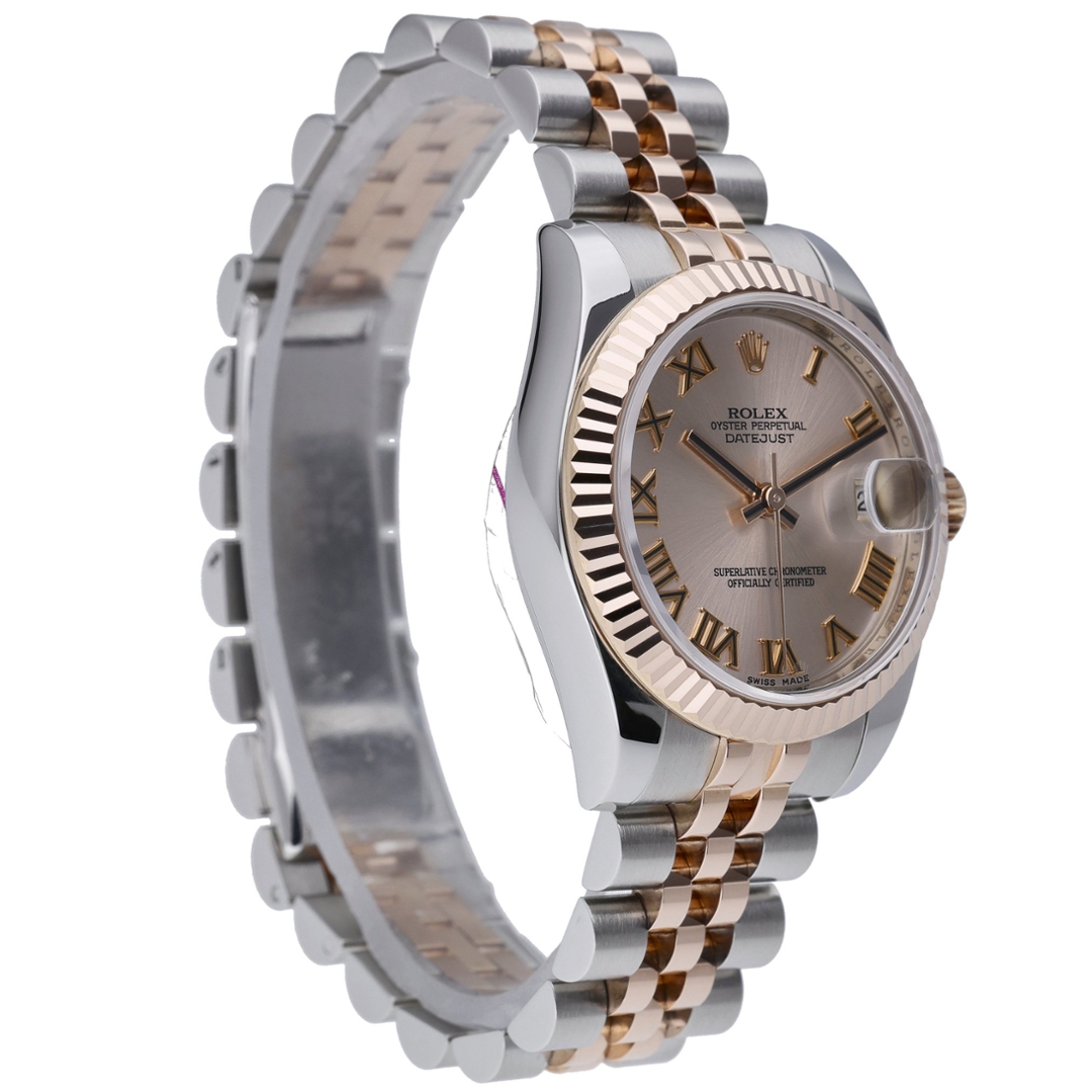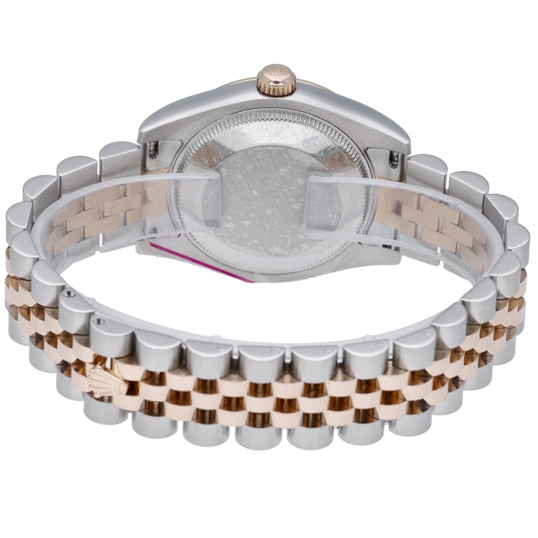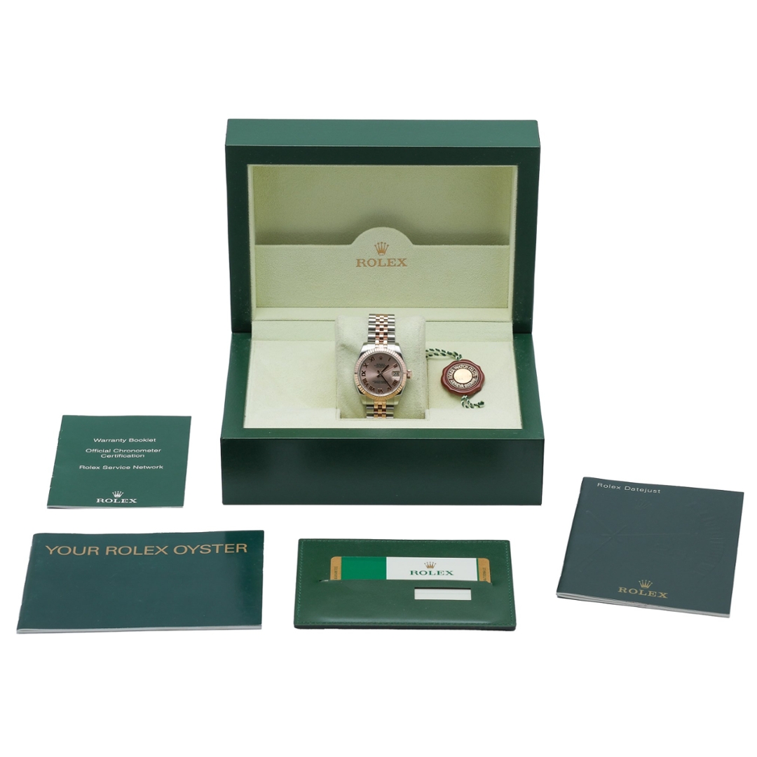 A Bi-Metal Rolex Datejust, model 178271, beautifully exemplifies refined luxury and timeless design. Crafted from stainless steel and 18ct rose gold, this elegant 31mm timepiece features the signature fluted bezel that reflects light with a subtle brilliance, perfectly complementing the soft pink dial. The dial is adorned with bold Roman numeral hour markers and a magnified date display at three o’clock, striking a balance between sophistication and everyday wearability.