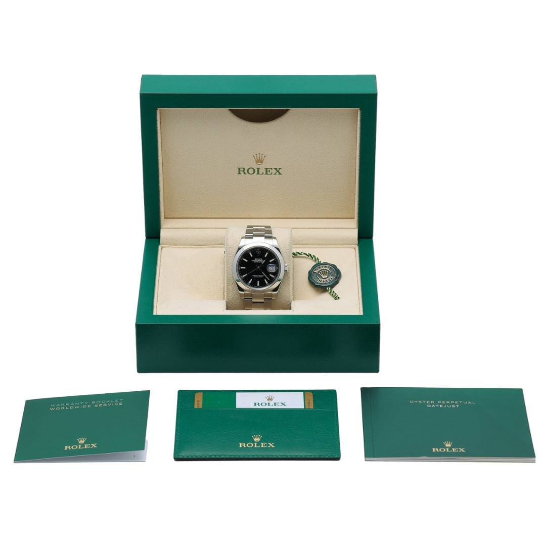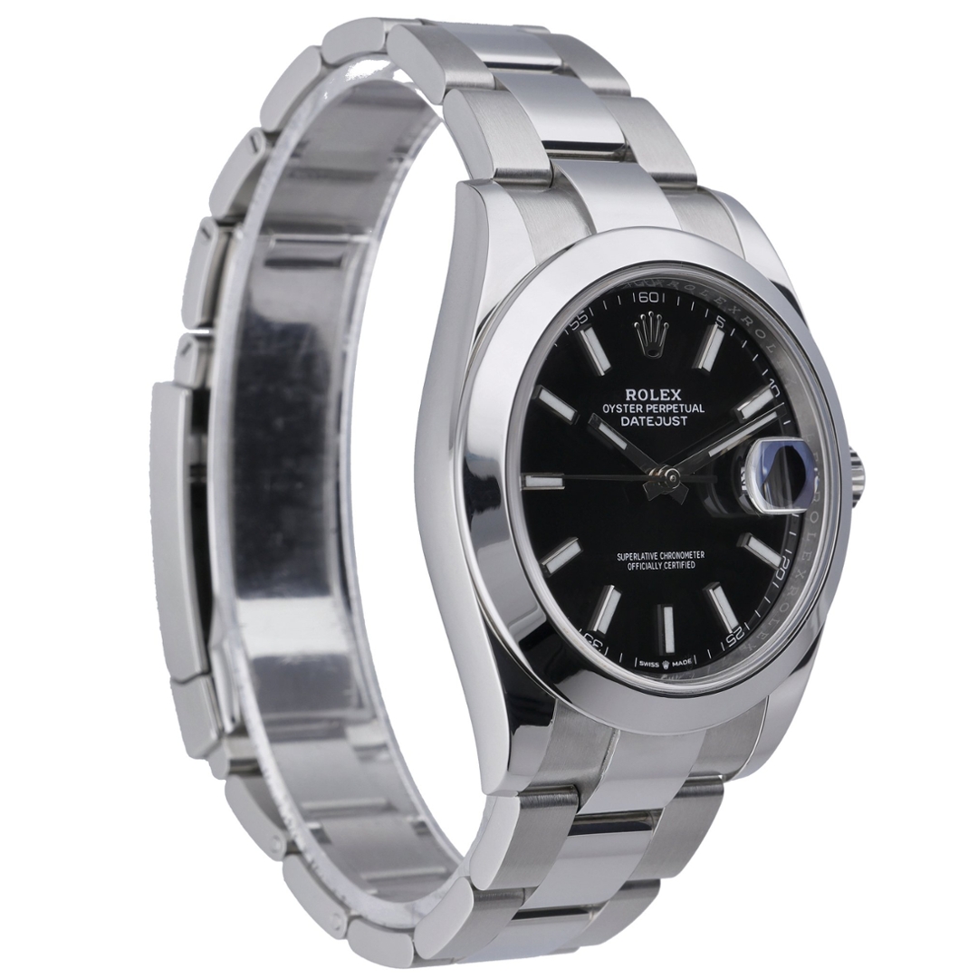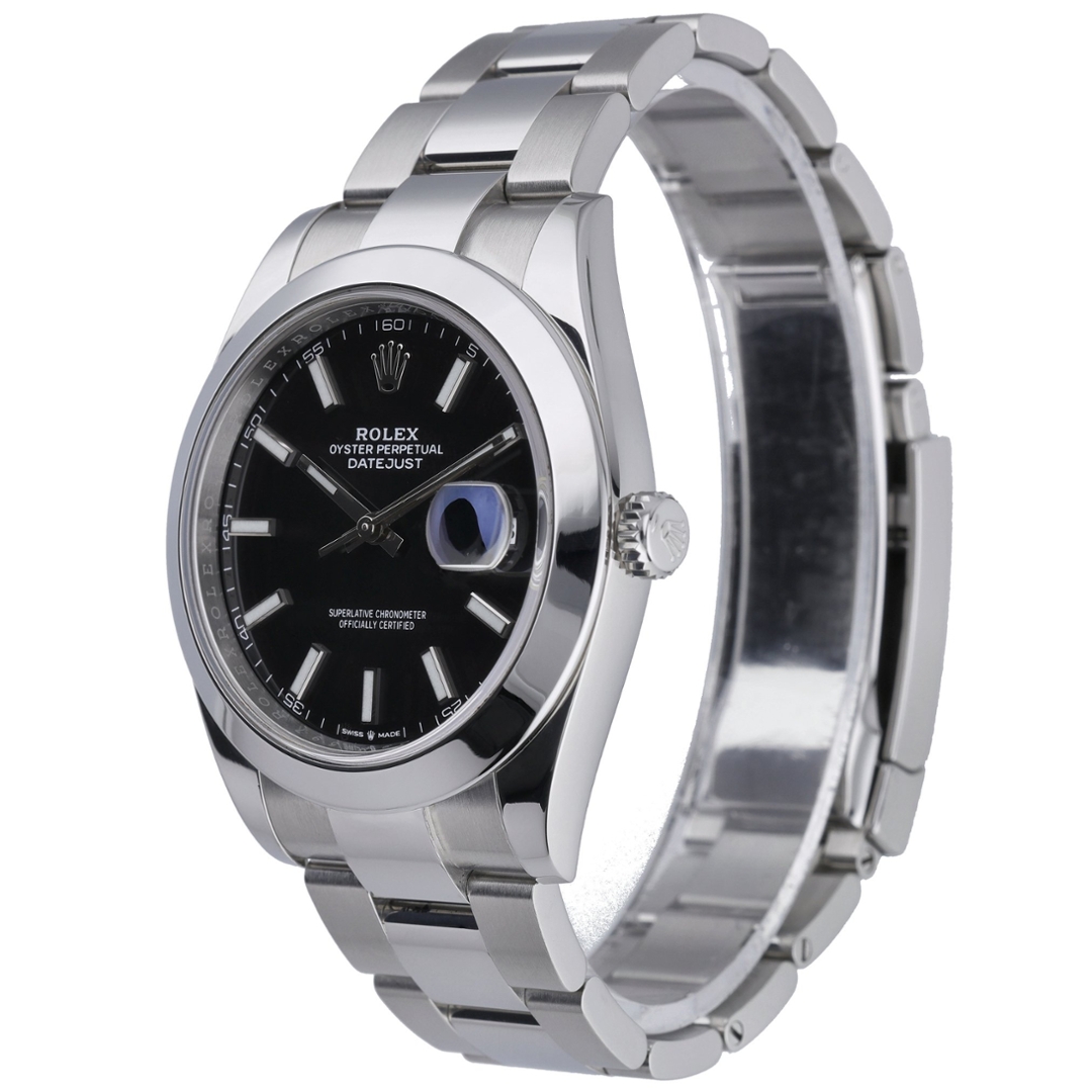 A Rolex Datejust 41 Watch that combines timeless design with contemporary precision. Crafted entirely from stainless steel, this elegant model features a striking black dial accented by luminous baton hour markers and a date aperture at 3 o’clock, magnified by Rolex’s signature Cyclops lens. The smooth bezel and robust Oyster bracelet provide a refined yet modern aesthetic, making it an effortlessly versatile choice for any occasion.