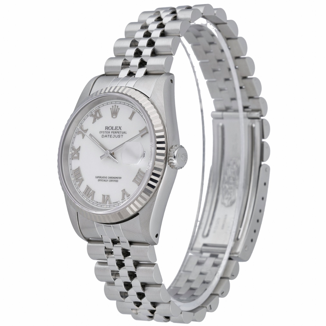 A Rolex Datejust 36, model 16234, perfectly embodies the enduring sophistication and craftsmanship synonymous with the Rolex name. Crafted from stainless steel and finished with an 18ct white gold fluted bezel, this elegant timepiece captures the timeless appeal of the classic Datejust design. The crisp white dial, detailed with bold black Roman numeral hour markers, creates a striking contrast that enhances both legibility and style.