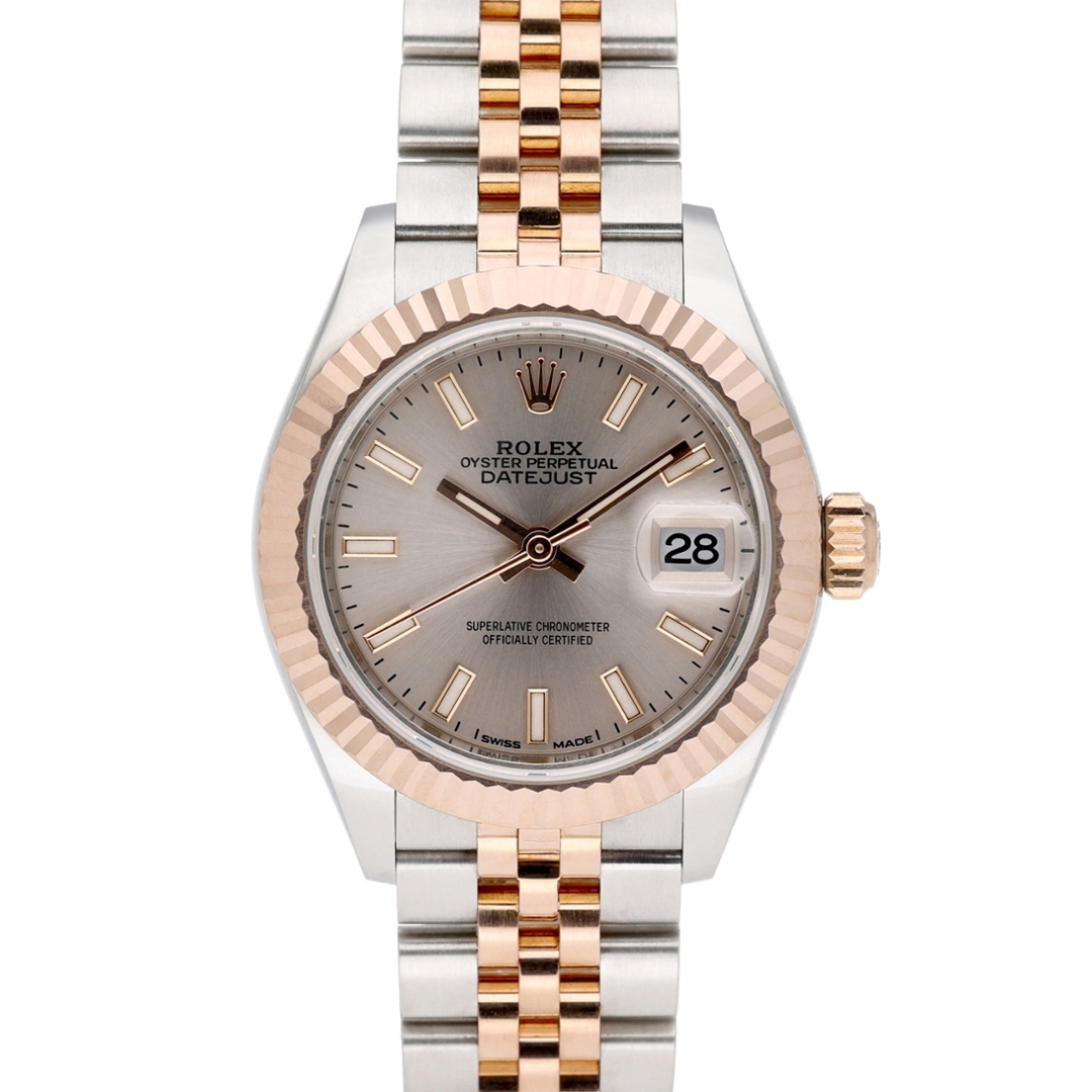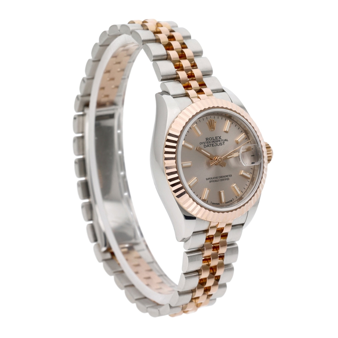 A Bi-Metal Rolex Datejust, model 279171, embodies timeless elegance and modern refinement in a beautifully compact form. Crafted from stainless steel and 18ct Everose gold, this 28mm model showcases Rolex’s mastery of proportion and detail. The exquisite pink sundust dial — a radiant blend of rose and champagne tones with a sunray finish — captures and reflects the light beautifully, giving the watch a soft, luxurious glow. Complemented by Everose gold baton hour markers and hands, it achieves a perfect harmony of sophistication and readability.
