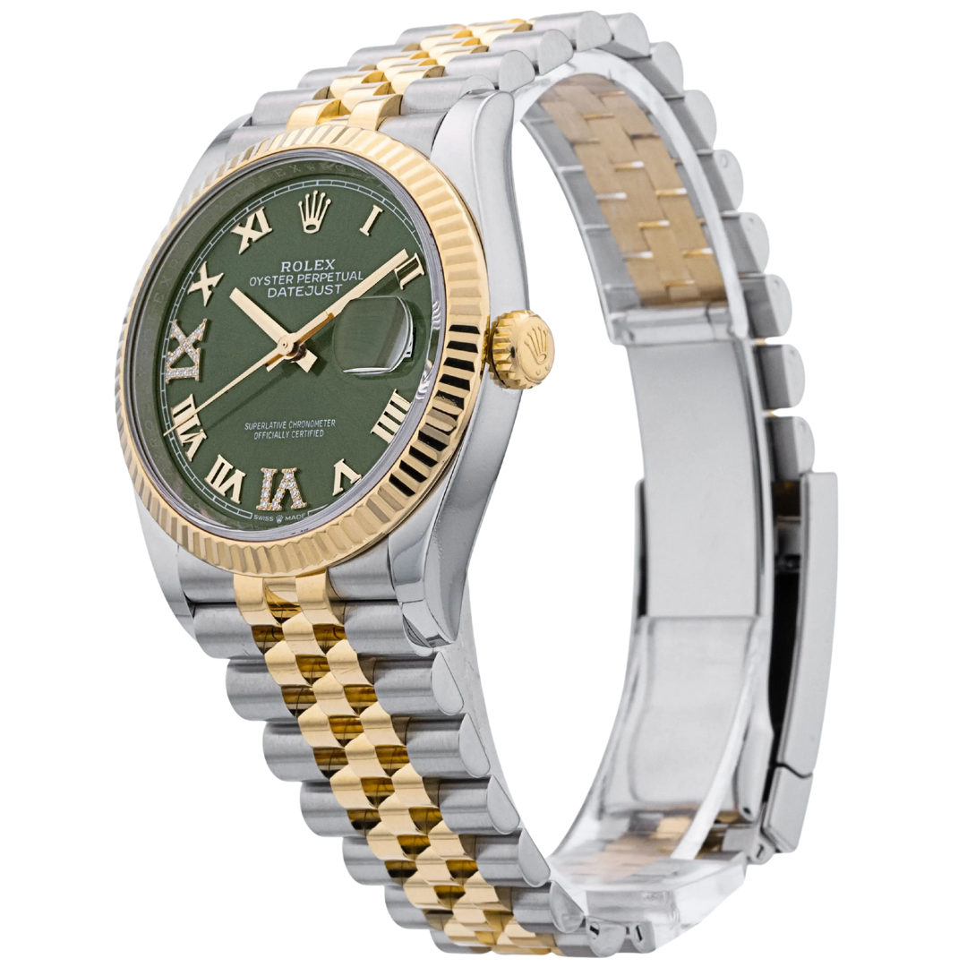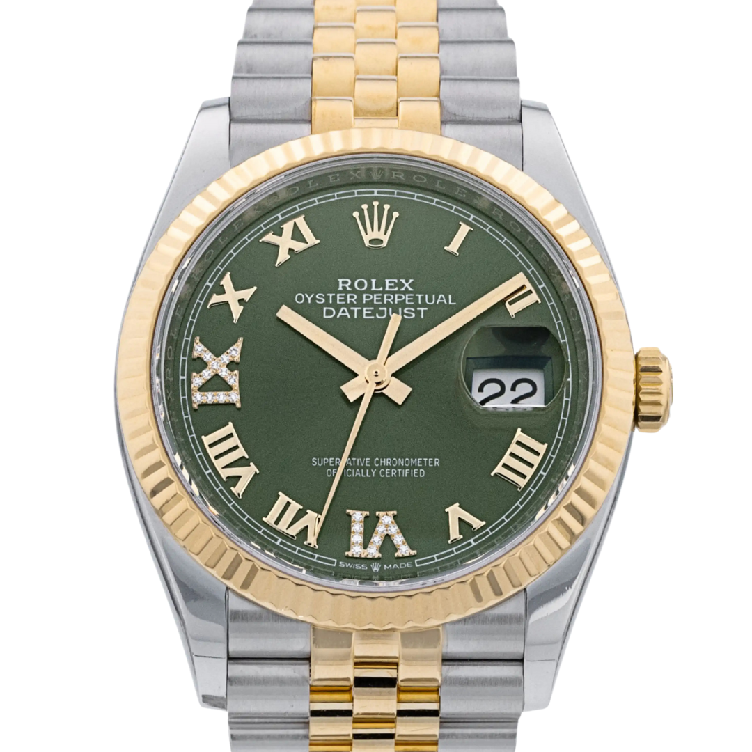 A Rolex Datejust 126233 is a remarkable fusion of elegance, craftsmanship, and timeless design. This 2024 model, crafted from stainless steel and 18ct yellow gold, features a striking green dial, offering a vibrant and unique twist on the classic Datejust aesthetic. The dial is further enhanced with original Rolex diamond numerals at 6 and 9 o'clock, adding a luxurious touch of brilliance and sophistication to the watch. Its 36mm case size perfectly balances presence and wearability, making it an ideal timepiece for any occasion.