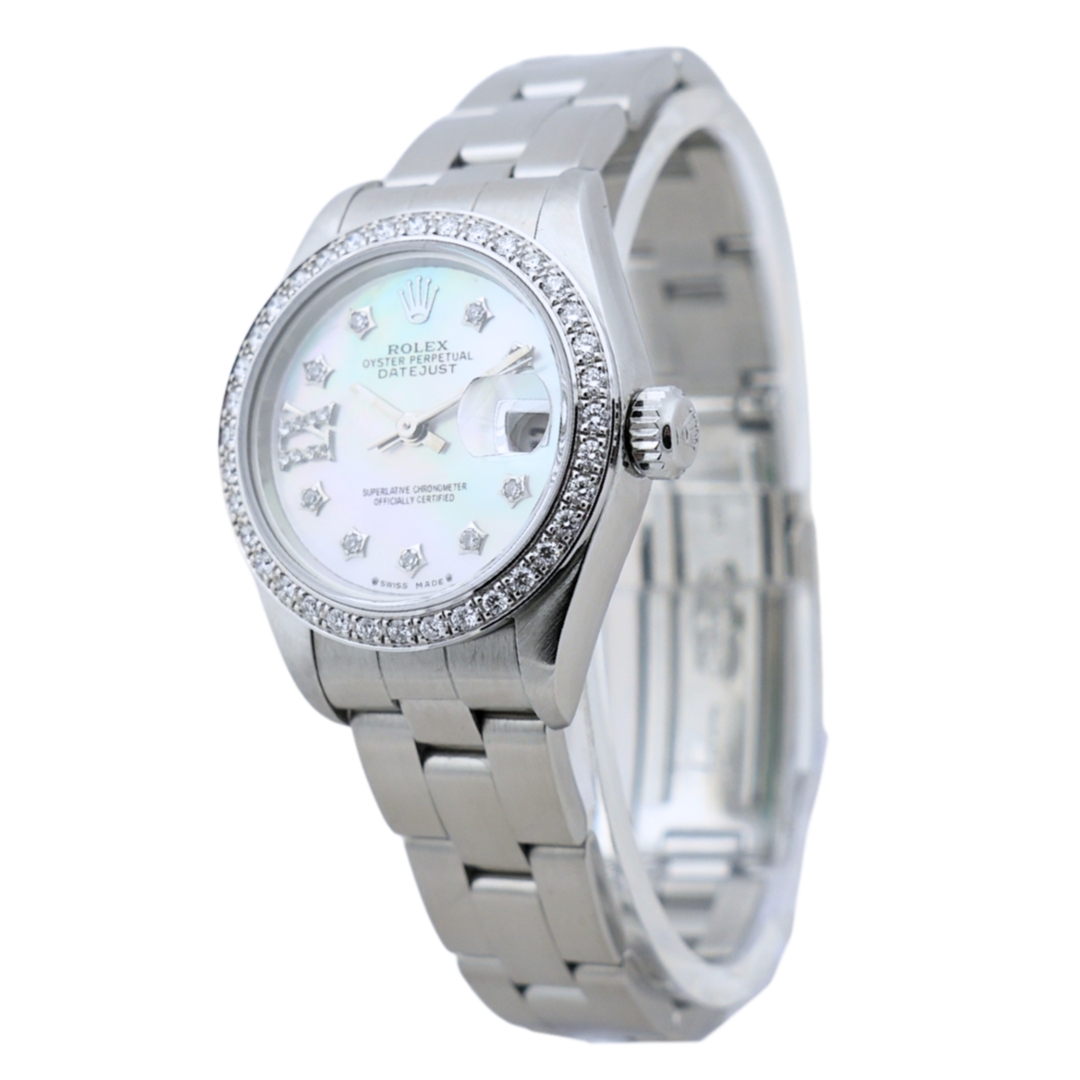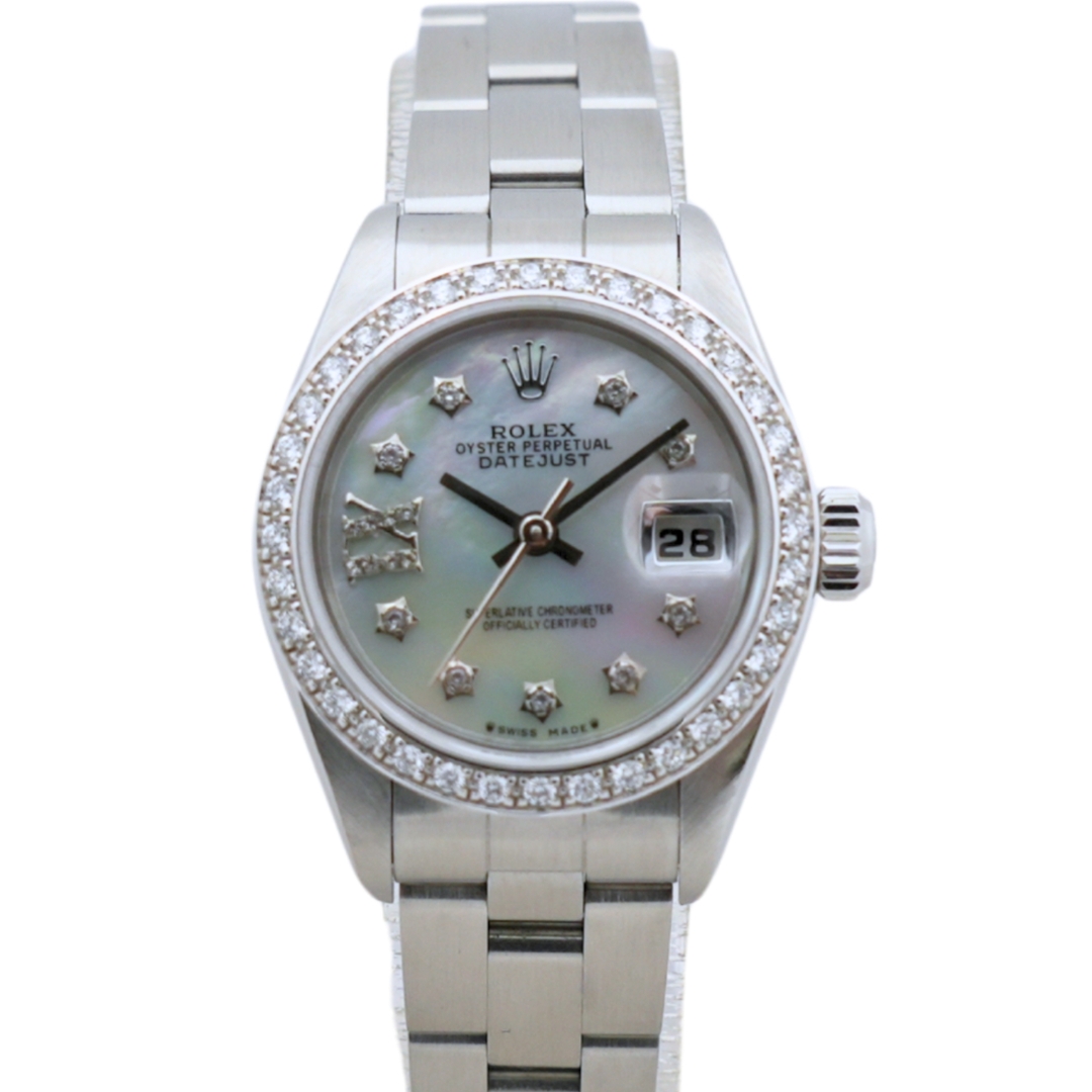 A trusted Rolex automatic movement is at its core, ensuring smooth timekeeping and dependable daily performance. The iridescent mother-of-pearl dial shifts gently in the light, enhanced by the sparkle of star-shaped diamond markers and a bezel with brilliant-cut stones. Combined with a polished Oyster case and bracelet, this Datejust presents an eye-catching balance of luxury and grace.