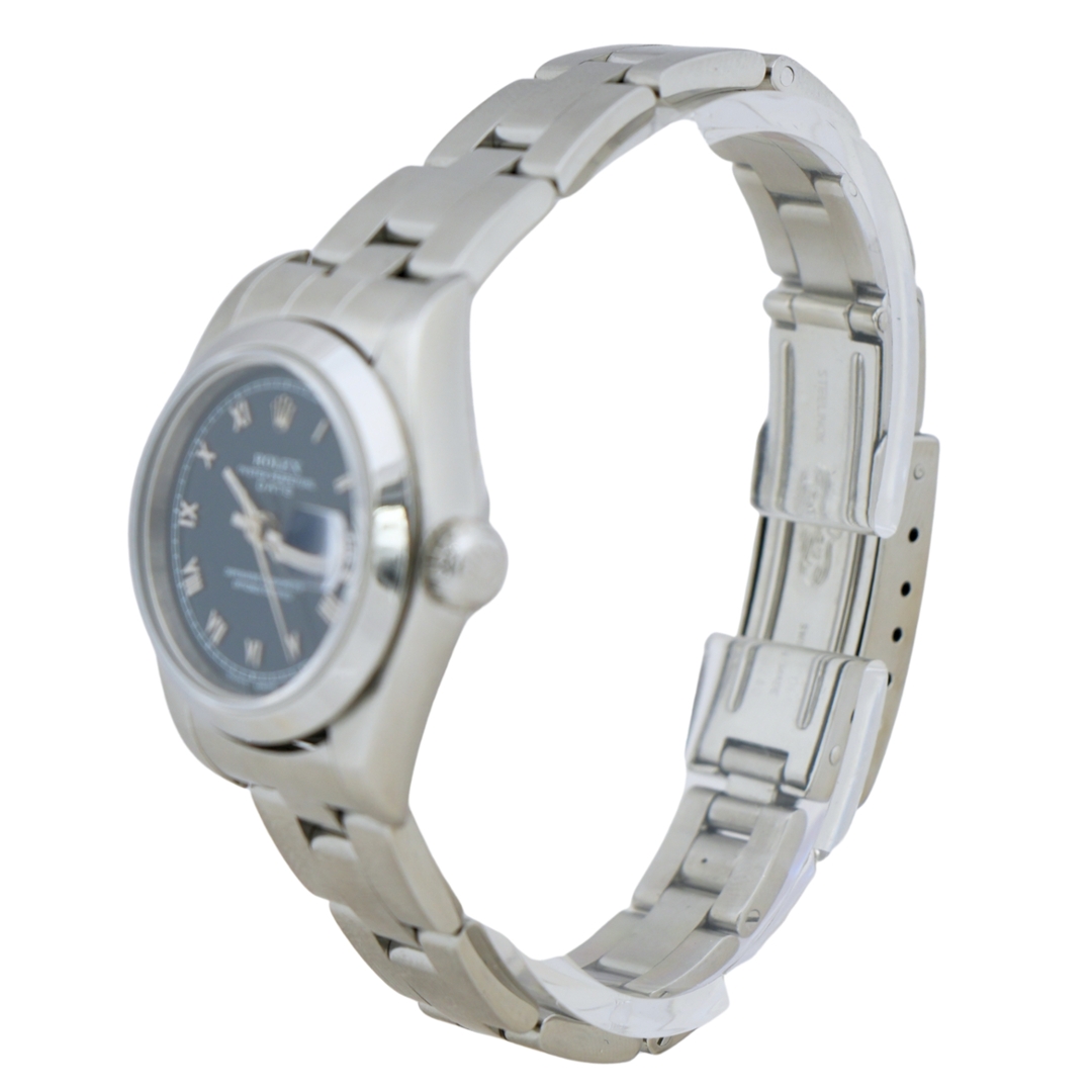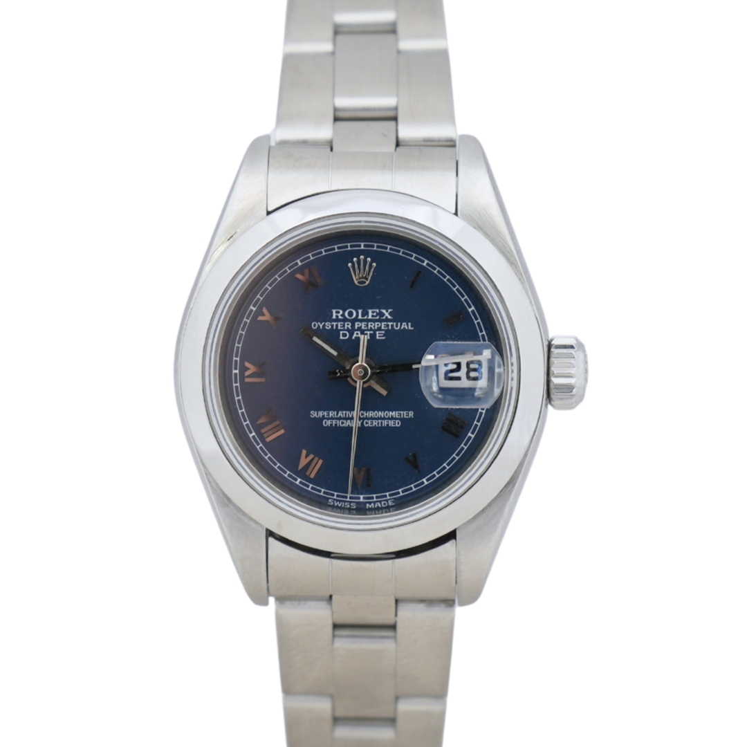 A Rolex Datejust, reference 79160, presents a perfect balance of classic elegance and timeless design. Crafted entirely from stainless steel, this refined 26mm model showcases the signature smooth bezel and a striking blue dial adorned with crisp Roman numeral hour markers. The vivid blue tone adds a touch of sophistication and individuality, while the dial layout remains unmistakably Rolex — clean, balanced, and effortlessly stylish.