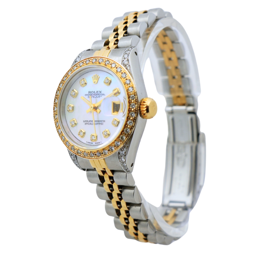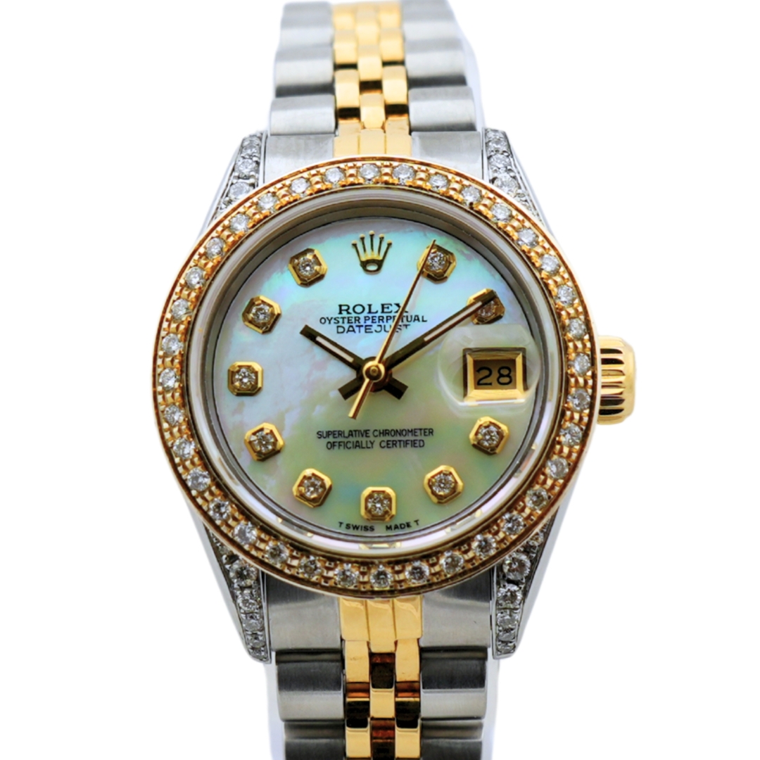 A Bi-Metal Rolex Datejust, reference 69173, showcases a perfect harmony of luxury and craftsmanship in a timeless design. Crafted from stainless steel and 18ct yellow gold, this elegant 26mm model is enhanced with an exquisite afterset diamond bezel and diamond-set shoulders, creating a captivating brilliance from every angle. It's stunning after-market mother-of-pearl dial adds iridescent depth and charm, beautifully complemented by diamond hour markers set in yellow gold for an unmistakably luxurious finish.