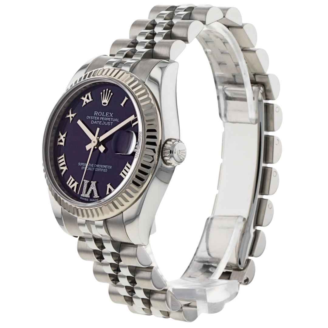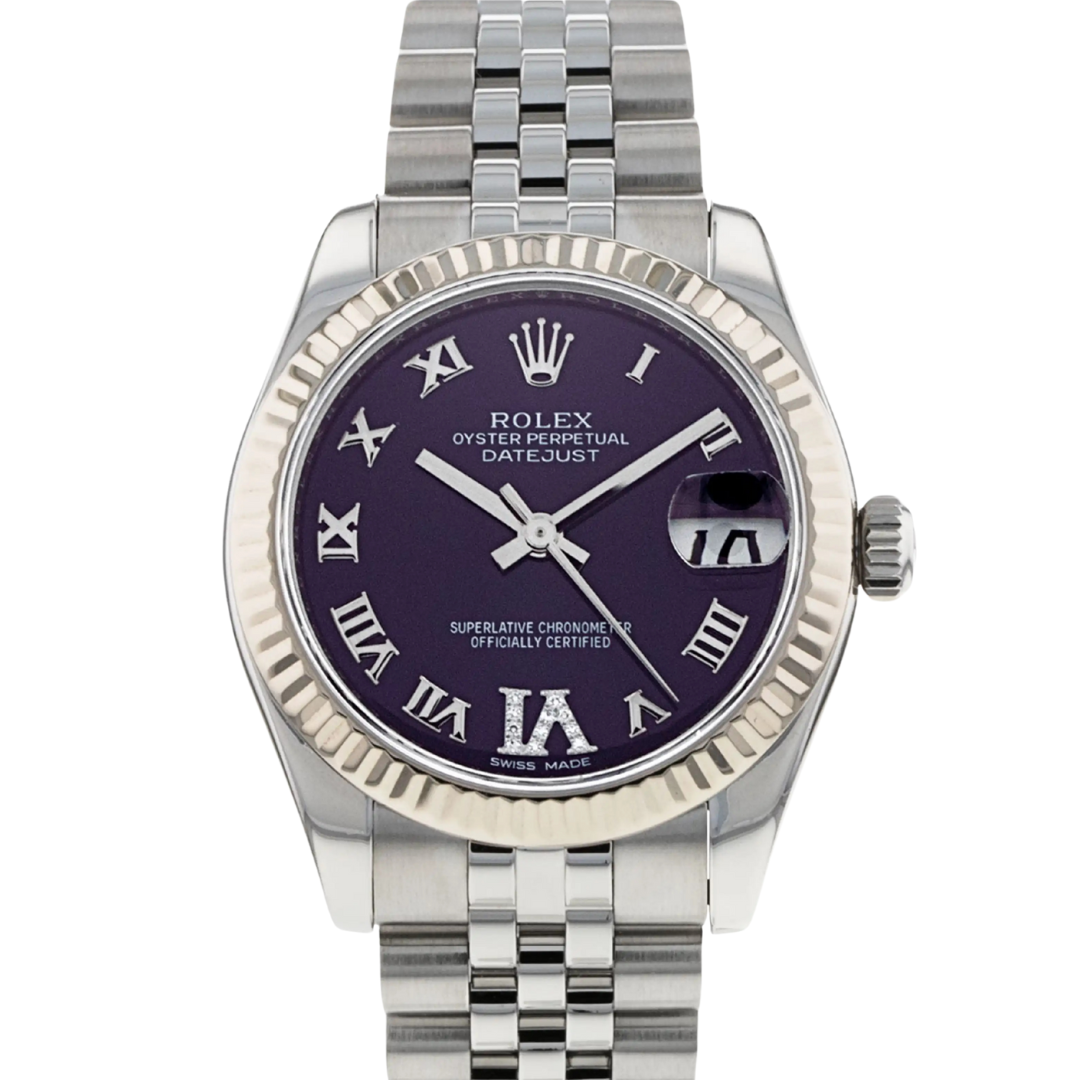 A Bi-Metal Rolex Datejust, reference 178274, showcases refined sophistication and contemporary charm in perfect harmony. Crafted from stainless steel and 18ct white gold, this elegant 31mm model features the iconic fluted bezel paired beautifully with a deep purple dial. The dial’s Roman numeral hour markers exude timeless style, while the number six is uniquely adorned with original Rolex-set diamonds — a subtle yet striking detail that elevates the watch’s luxurious character.