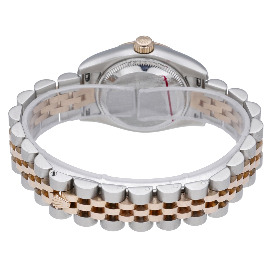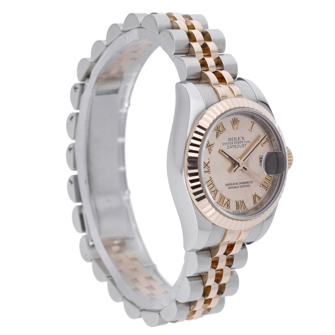 A bi-metal Rolex Datejust 26, combining stainless steel with warm 18ct rose gold for a look that feels effortlessly elegant and unmistakably luxurious. This reference 179171 features a charming pink dial enriched with rose-gold Roman numeral hour markers, creating a soft yet striking aesthetic that has become one of the most sought-after configurations in the ladies’ Datejust range.