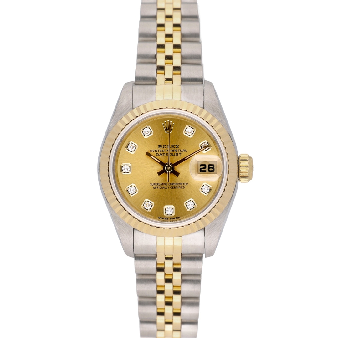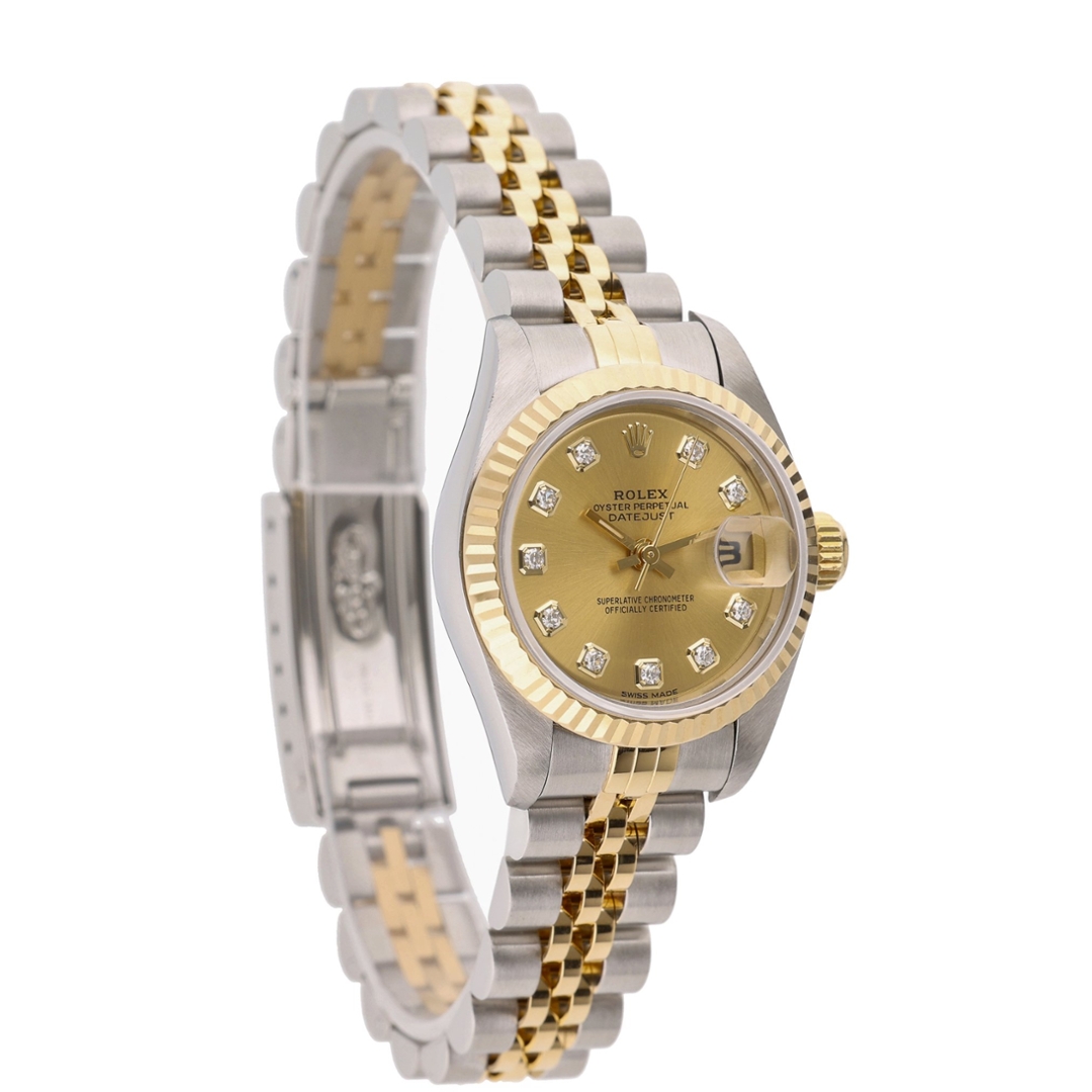 A Rolex Datejust 69173 is a stunning blend of luxury and timeless design, offering an elegant, refined aesthetic. This 1999 model, crafted from stainless steel and 18ct yellow gold, features a beautiful champagne dial enhanced by the original Rolex diamond numerals. These sparkling accents add an extra layer of sophistication, making it a standout piece. Its 26mm case size offers a delicate and graceful fit, perfect for those who appreciate smaller, more refined watches.