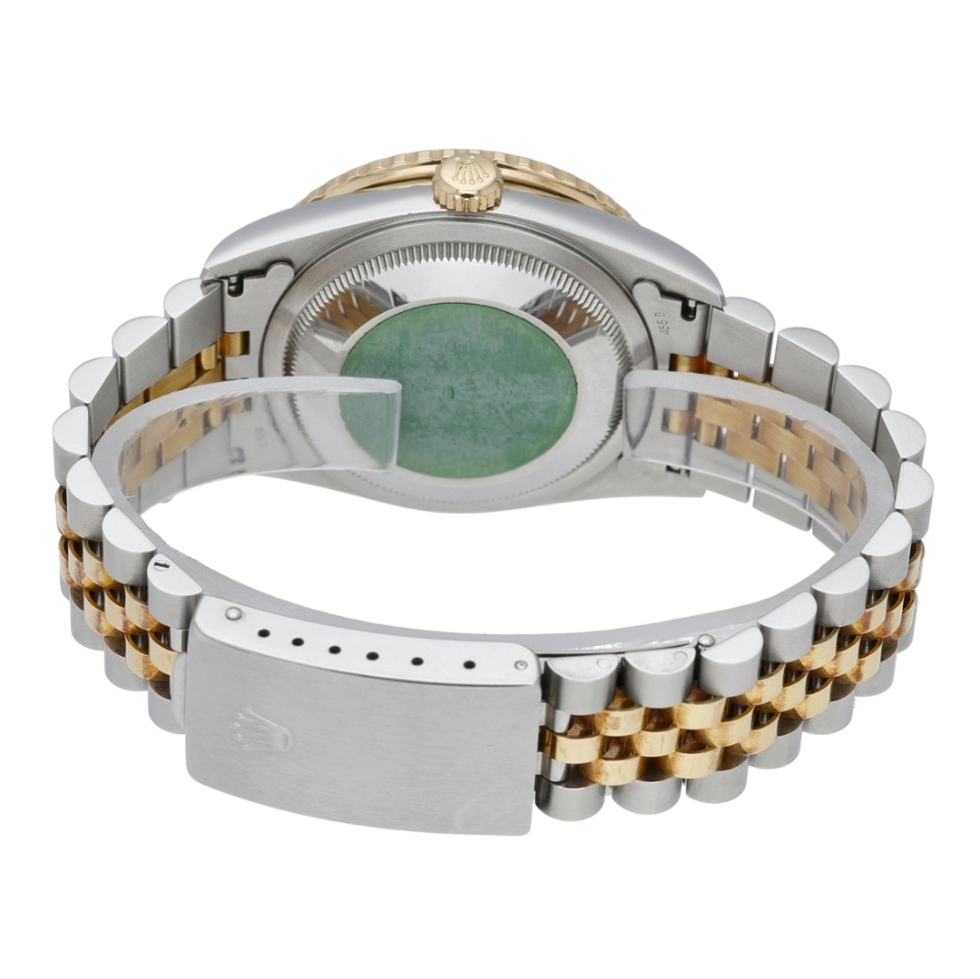 A bi-metal Rolex Datejust Turn-O-Graph 16263 stands out immediately thanks to its iconic 18ct yellow gold rotating bezel, a feature that sets it apart from all traditional Datejust models. Designed with engraved 10–50 numerals and a bold triangular marker, this bezel transforms the watch from a simple time-and-date piece into a practical timing instrument. With a smooth bidirectional rotation, it allows the wearer to measure elapsed minutes with ease. This functional twist gives the watch a dynamic, tool-watch personality rarely seen in the Datejust family.