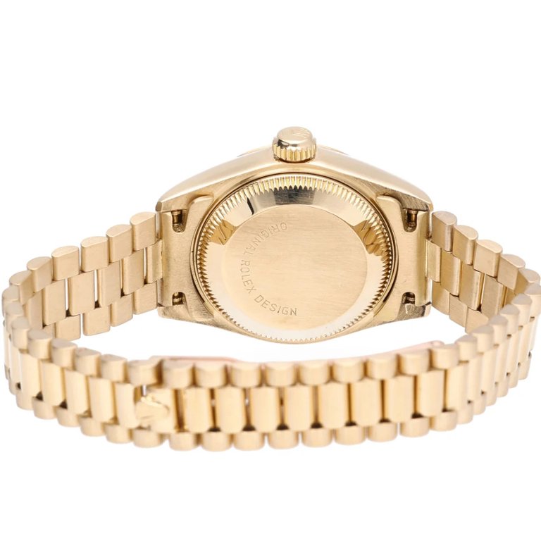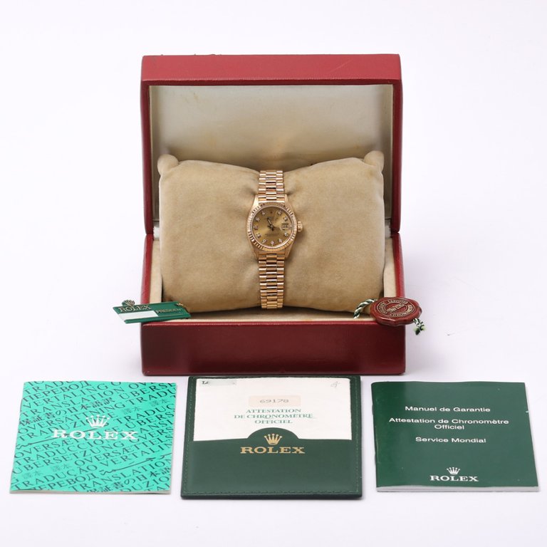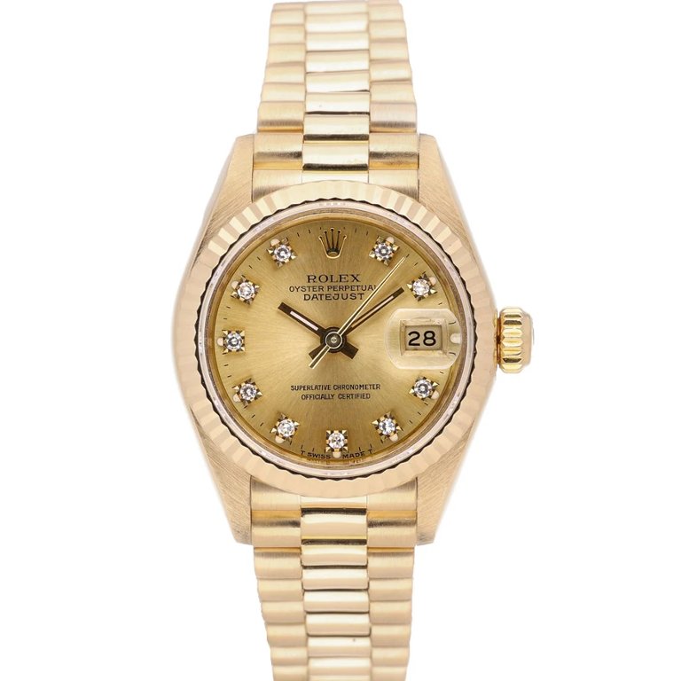 Its allure is further enhanced by the iconic yellow-gold fluted bezel, a hallmark of Rolex craftsmanship. The bezel frames a captivating champagne dial adorned with original diamond numeral markers. Each diamond sparkles with brilliance, adding a touch of glamour and sophistication to the watch's already distinguished appearance.