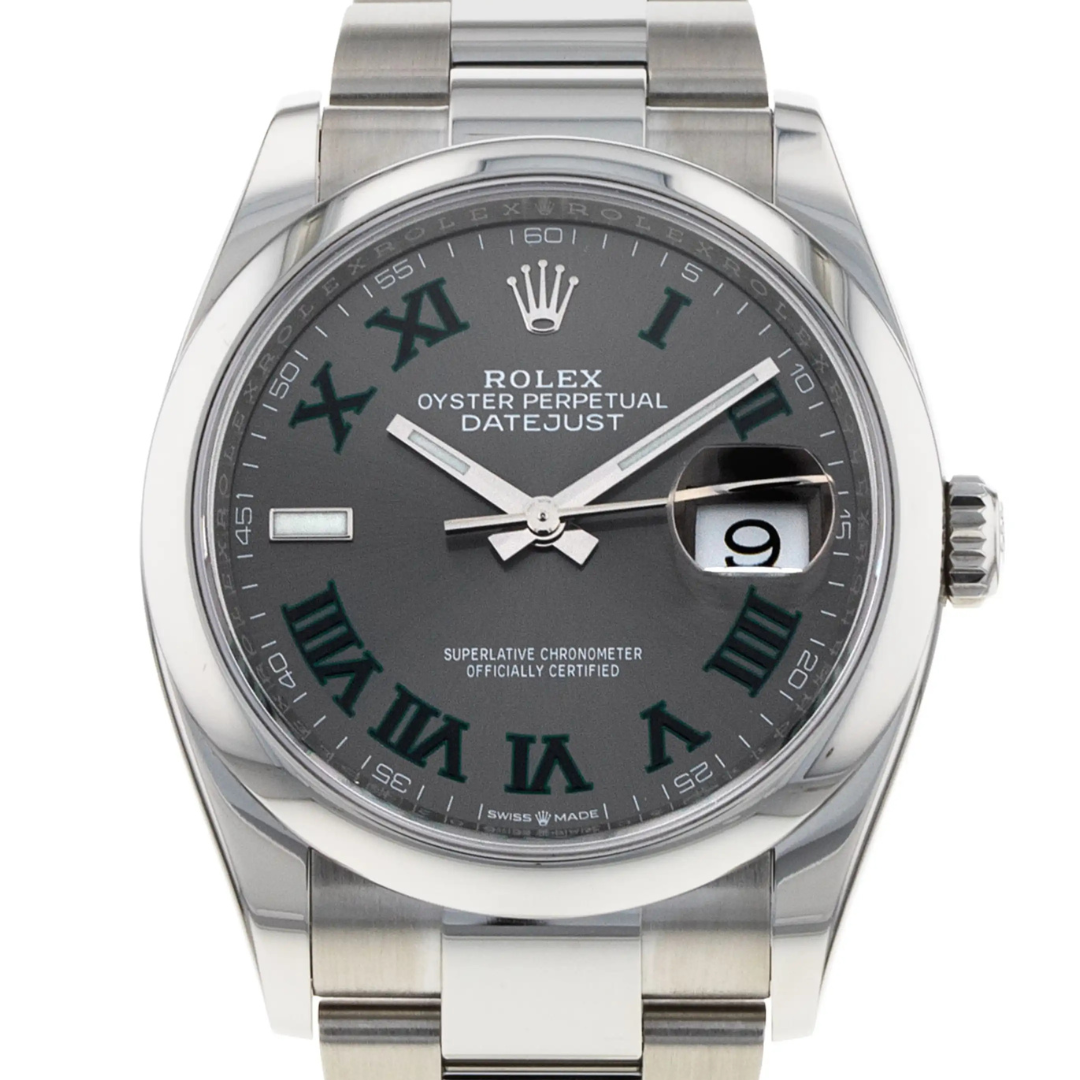 A Rolex Datejust 126200, a sleek and modern iteration of the classic Datejust design, is a stunning timepiece that combines precision, style, and versatility. This 2024 model is crafted from stainless steel, offering robustness and a refined aesthetic. The 36mm case provides a more significant wrist presence while maintaining a timeless, elegant profile. The slate dial is striking, offering a dark, sophisticated hue that contrasts beautifully with the polished silver hour markers and hands. This contemporary colour choice gives the watch a unique, understated look that is versatile for any occasion.