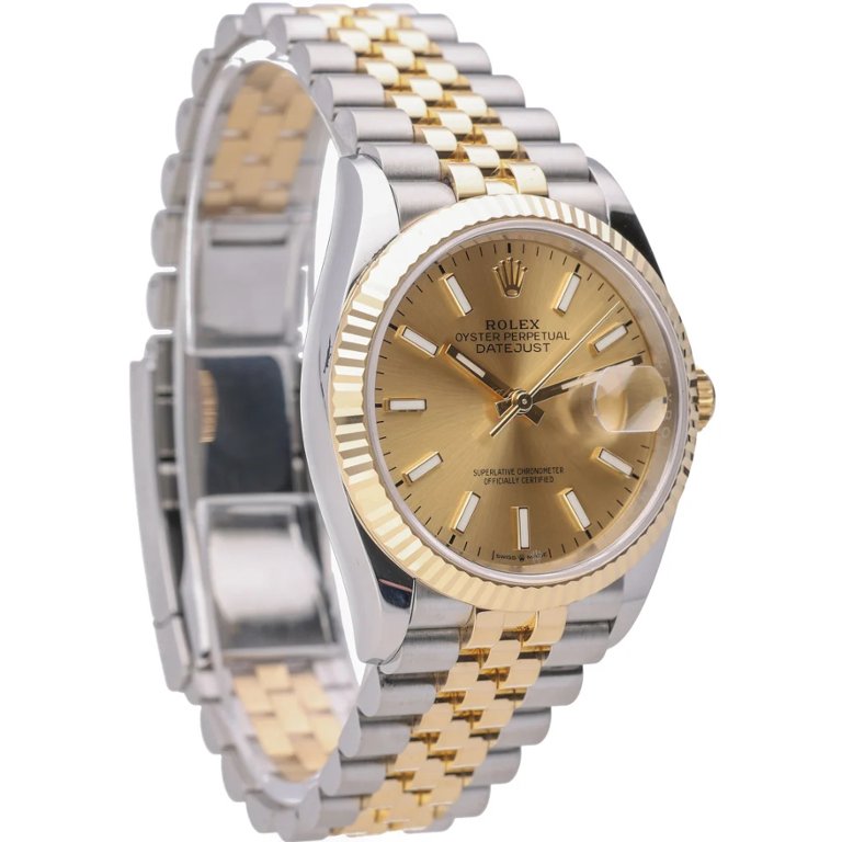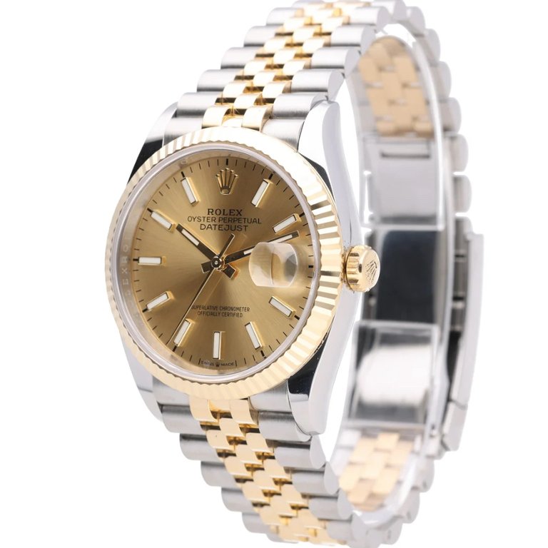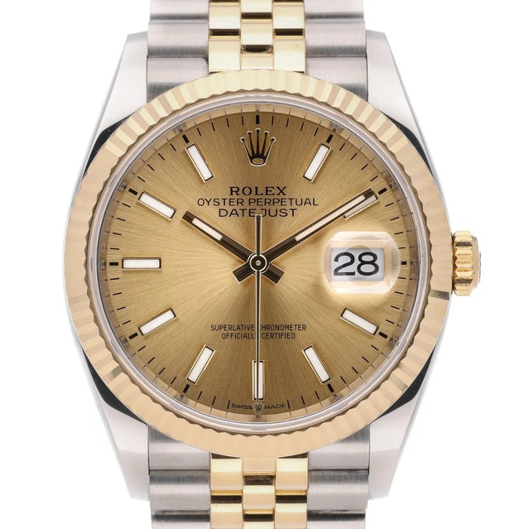 Measuring a classic 36mm in diameter, its proportions strike a harmonious balance between understated sophistication and undeniable presence. Adorned with a striking yellow-gold fluted bezel, the watch commands attention with its resplendent aesthetic, further accentuated by the captivating gold dial that glimmers with every passing moment.