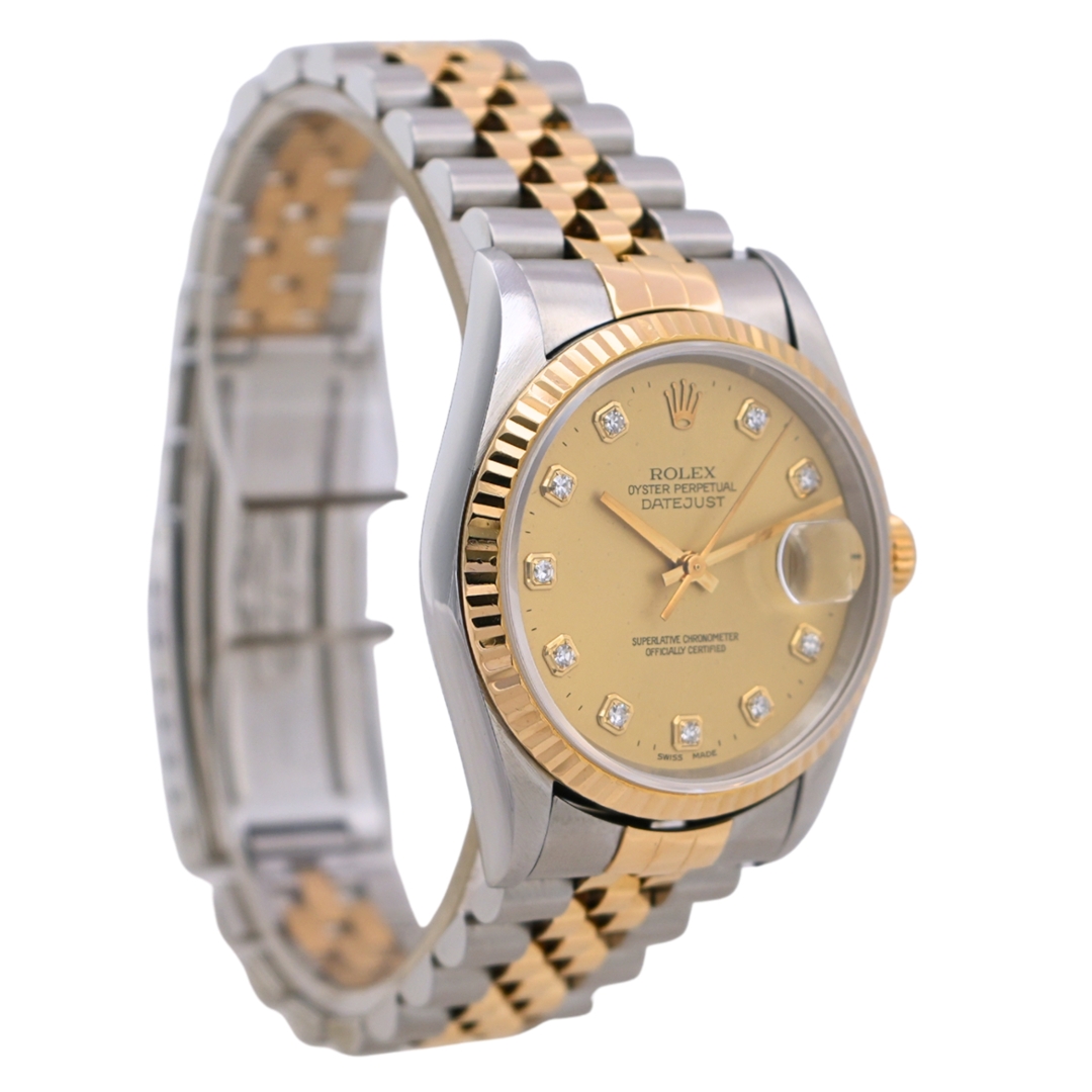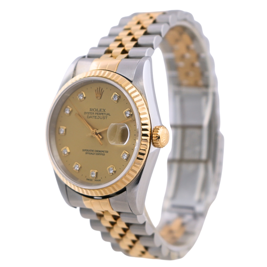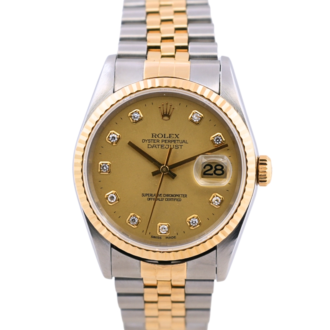 A Bi-Metal Rolex Datejust Watch, Stainless Steel and 18ct Yellow Gold with a Yellow Gold Fluted Bezel and a Champagne Dial with Original Rolex Diamond Numerals