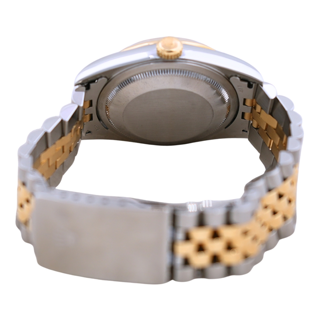 A bi-metal Rolex Datejust 16233, this 36mm stainless steel and 18ct yellow gold example offers the timeless appeal of one of Rolex’s most recognisable configurations. The watch features a champagne dial set with original Rolex diamond hour markers, paired with a yellow gold fluted bezel that reinforces its classic Datejust character. This combination remains one of the most consistently sought-after in the Datejust family, appealing both to collectors and buyers seeking a dependable long-term asset.
