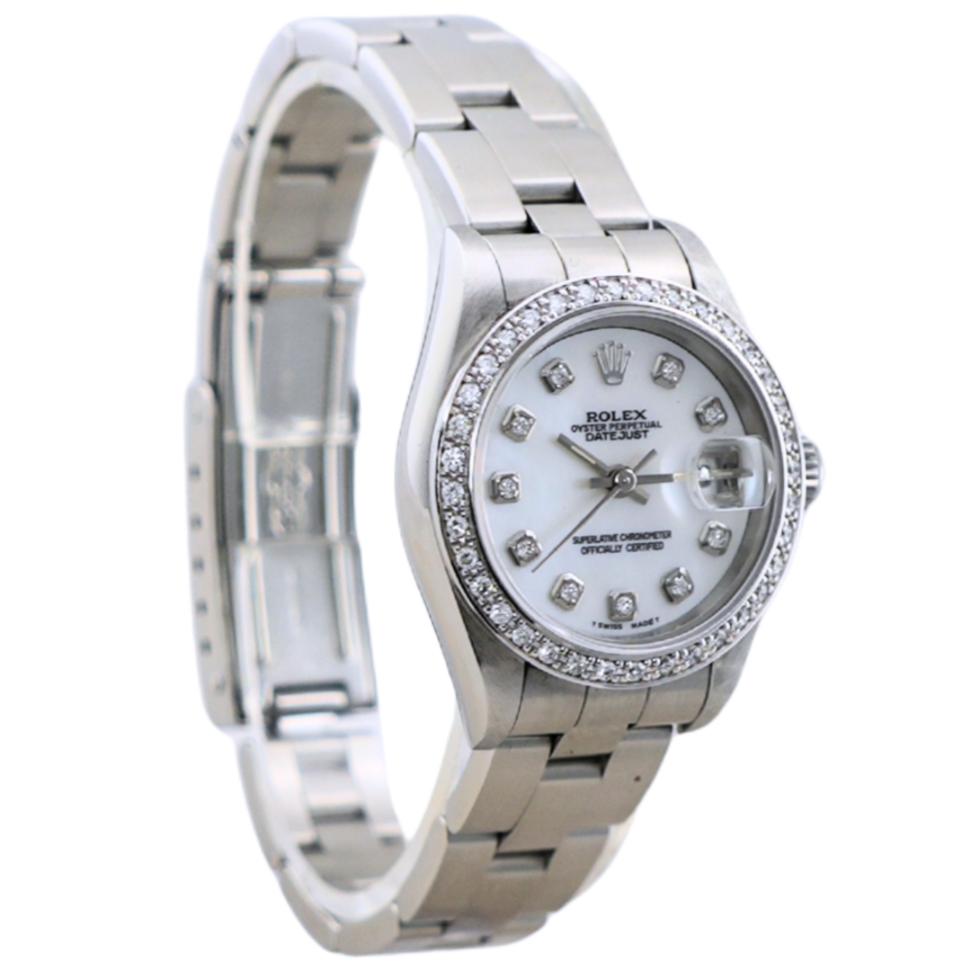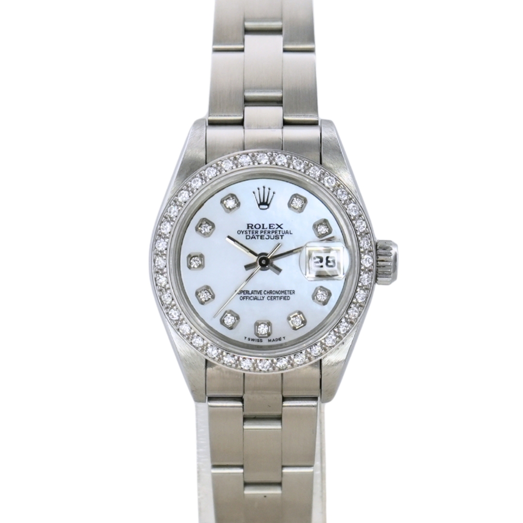 A Rolex Datejust 69190, crafted in stainless steel and upgraded with an afterset diamond bezel and afterset white mother of pearl dial, featuring brilliant-cut diamond hour markers — an elegant and eye-catching update to one of Rolex’s most enduring references. Sized at 26mm, this classic Lady-Datejust features a timeless profile with modern sparkle, making it ideal for both daily elegance and special occasions.