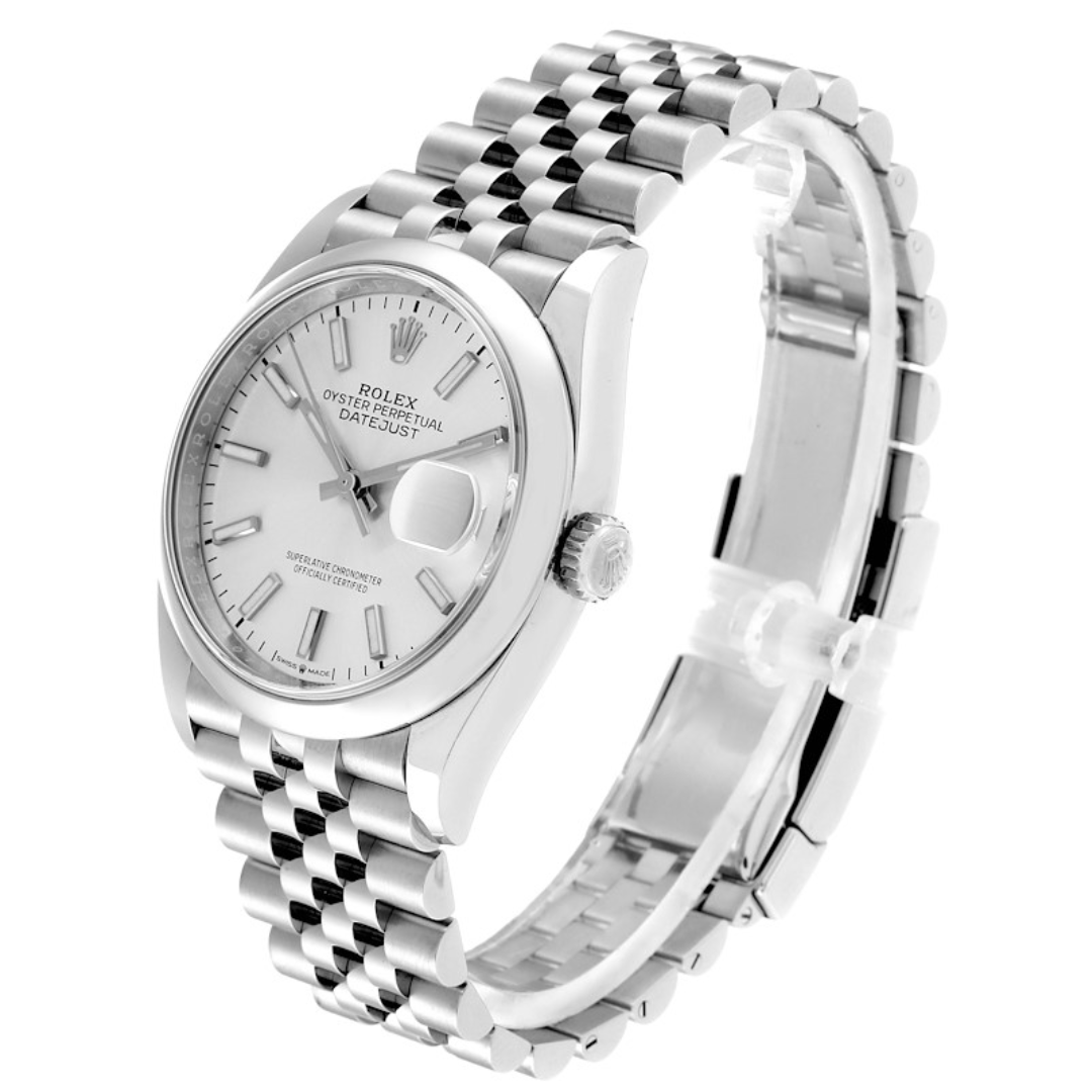 This 2025 Rolex Datejust 36 pairs a stainless steel Oyster case with a clean, understated silver dial, giving the watch a classic, versatile presence. The 36mm profile retains the traditional proportions of the Datejust line, while the luminous baton hour markers and smooth steel bezel offer a contemporary feel. Powered by the automatic Calibre 3235 movement, it delivers excellent precision and robust performance suited to daily wear.