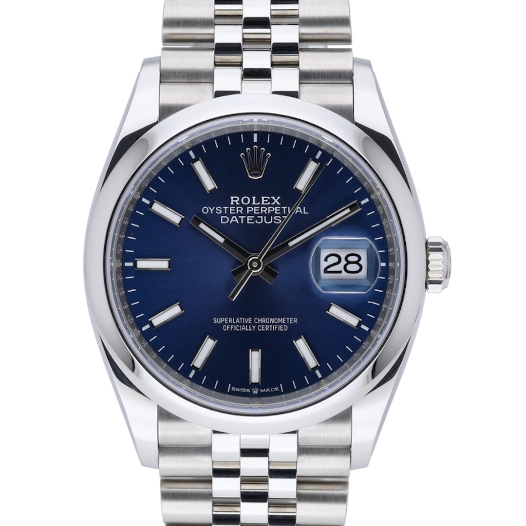 A Rolex Datejust 36 reference 126200 in stainless steel, presented with a rich blue dial that offers depth and clarity under changing light. The smooth steel bezel gives the watch a clean, contemporary profile, while the Jubilee bracelet adds comfort and a refined visual balance. This classic 36mm format remains one of the most versatile sizes in the Datejust range.